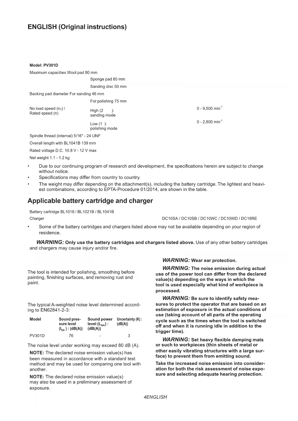 (dB(A)) Uncertainty (K) : (dB(A)) PV301D 76 - 3 The noise level under working may exceed 80 dB (A). NOTE: The declared noise emission value(s) has been measured in accordance with a standard test method and may be used for comparing one tool with another. NOTE: The declared noise emission value(s) may also be used in a preliminary assessment of exposure.