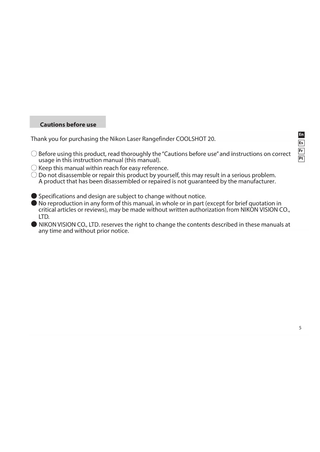 Cautions before use Thank you for purchasing the Nikon Laser Rangefinder COOLSHOT 20. 〇 Before using this product, read thoroughly the “Cautions before use” and instructions on correct usage in this instruction manual (this manual). 〇 Keep this manual within reach for easy reference. 〇 Do not disassemble or repair this product by yourself, this may result in a serious problem. A product that has been disassembled or repaired is not guaranteed by the manufacturer. ● Specifications and design are subject to change without notice. ● No reproduction in any form of this manual, in whole or in part (except for brief quotation in critical articles or reviews), may be made without written authorization from NIKON VISION CO., LTD. ● NIKON VISION CO., LTD. reserves the right to change the contents described in these manuals at any time and without prior notice.6