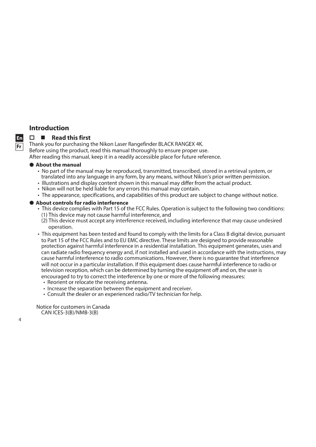Introduction Read this first Thank you for purchasing the Nikon Laser Rangefinder BLACK RANGEX 4K. Before using the product, read this manual thoroughly to ensure proper use. After reading this manual, keep it in a readily accessible place for future reference. l About the manual