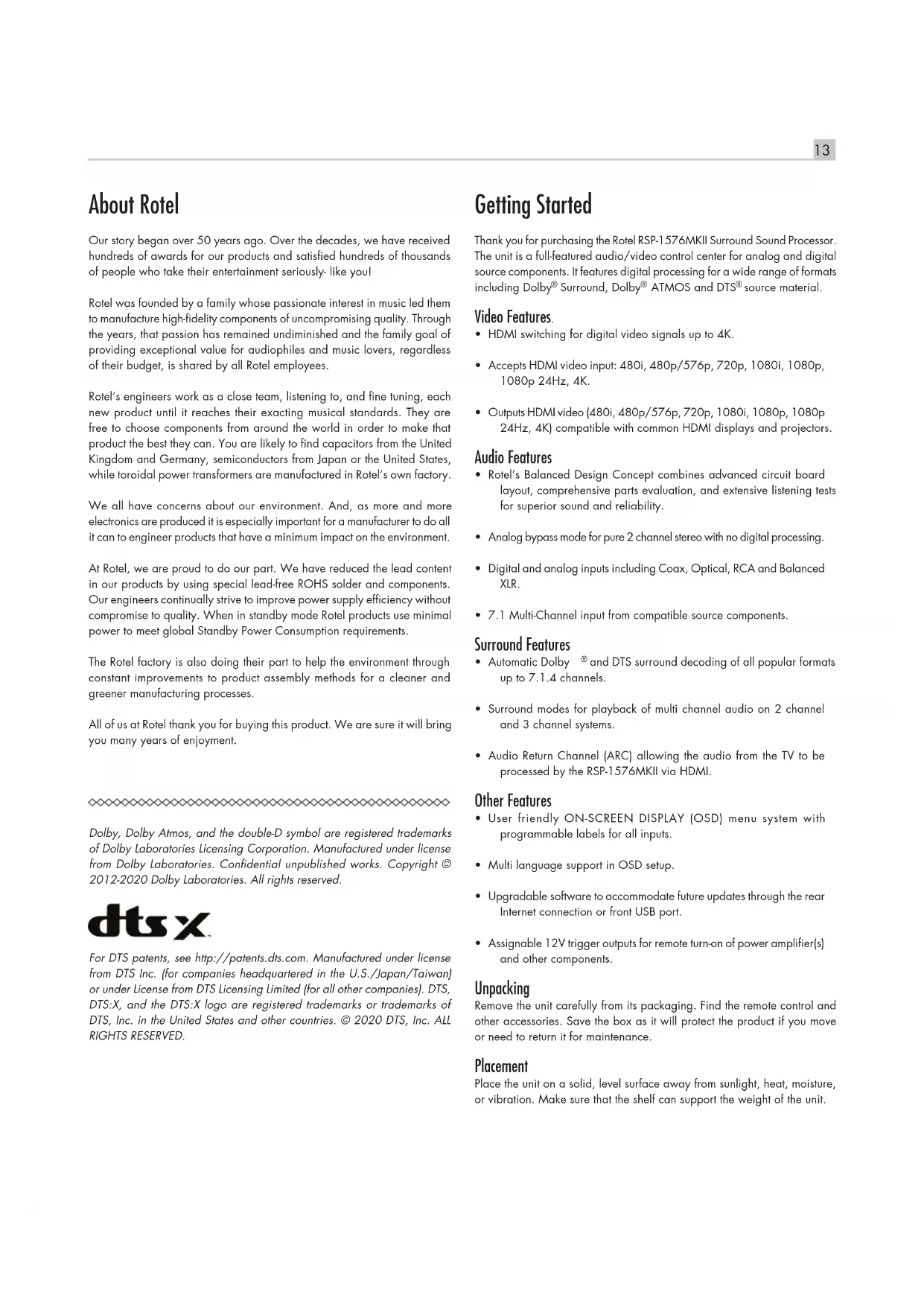 On-Screen Menus Afchage des menus à l’écran On-Screen-Menüs Sistema de Menús en Pantalla Schermmenu’s Menù sul display (OSD) Menyer Экранные меню13 About Rotel Our story began over 50 years ago. Over the decades, we have received hundreds of awards for our products and satised hundreds of thousands of people who take their entertainment seriously- like you! Rotel was founded by a family whose passionate interest in music led them to manufacture high-delity components of uncompromising quality. Through the years, that passion has remained undiminished and the family goal of providing exceptional value for audiophiles and music lovers, regardless of their budget, is shared by all Rotel employees. Rotel’s engineers work as a close team, listening to, and ne tuning, each new product until it reaches their exacting musical standards. They are free to choose components from around the world in order to make that product the best they can. You are likely to nd capacitors from the United Kingdom and Germany, semiconductors from Japan or the United States, while toroidal power transformers are manufactured in Rotel’s own factory. We all have concerns about our environment. And, as more and more electronics are produced it is especially important for a manufacturer to do all it can to engineer products that have a minimum impact on the environment. At Rotel, we are proud to do our part. We have reduced the lead content in our products by using special lead-free ROHS solder and components. Our engineers continually strive to improve power supply efciency without compromise to quality. When in standby mode Rotel products use minimal power to meet global Standby Power Consumption requirements. The Rotel factory is also doing their part to help the environment through constant improvements to product assembly methods for a cleaner and greener manufacturing processes. All of us at Rotel thank you for buying this product. We are sure it will bring you many years of enjoyment. Dolby, Dolby Atmos, and the double-D symbol are registered trademarks of Dolby Laboratories Licensing Corporation. Manufactured under license from Dolby Laboratories. Condential unpublished works. Copyright © 2012-2020 Dolby Laboratories. All rights reserved. For DTS patents, see http://patents.dts.com. Manufactured under license from DTS Inc. (for companies headquartered in the U.S./Japan/Taiwan) or under License from DTS Licensing Limited (for all other companies). DTS, DTS:X, and the DTS:X logo are registered trademarks or trademarks of DTS, Inc. in the United States and other countries. © 2020 DTS, Inc. ALL RIGHTS RESERVED. Getting Started Thank you for purchasing the Rotel RSP-1576MKII Surround Sound Processor. The unit is a full-featured audio/video control center for analog and digital source components. It features digital processing for a wide range of formats including Dolby