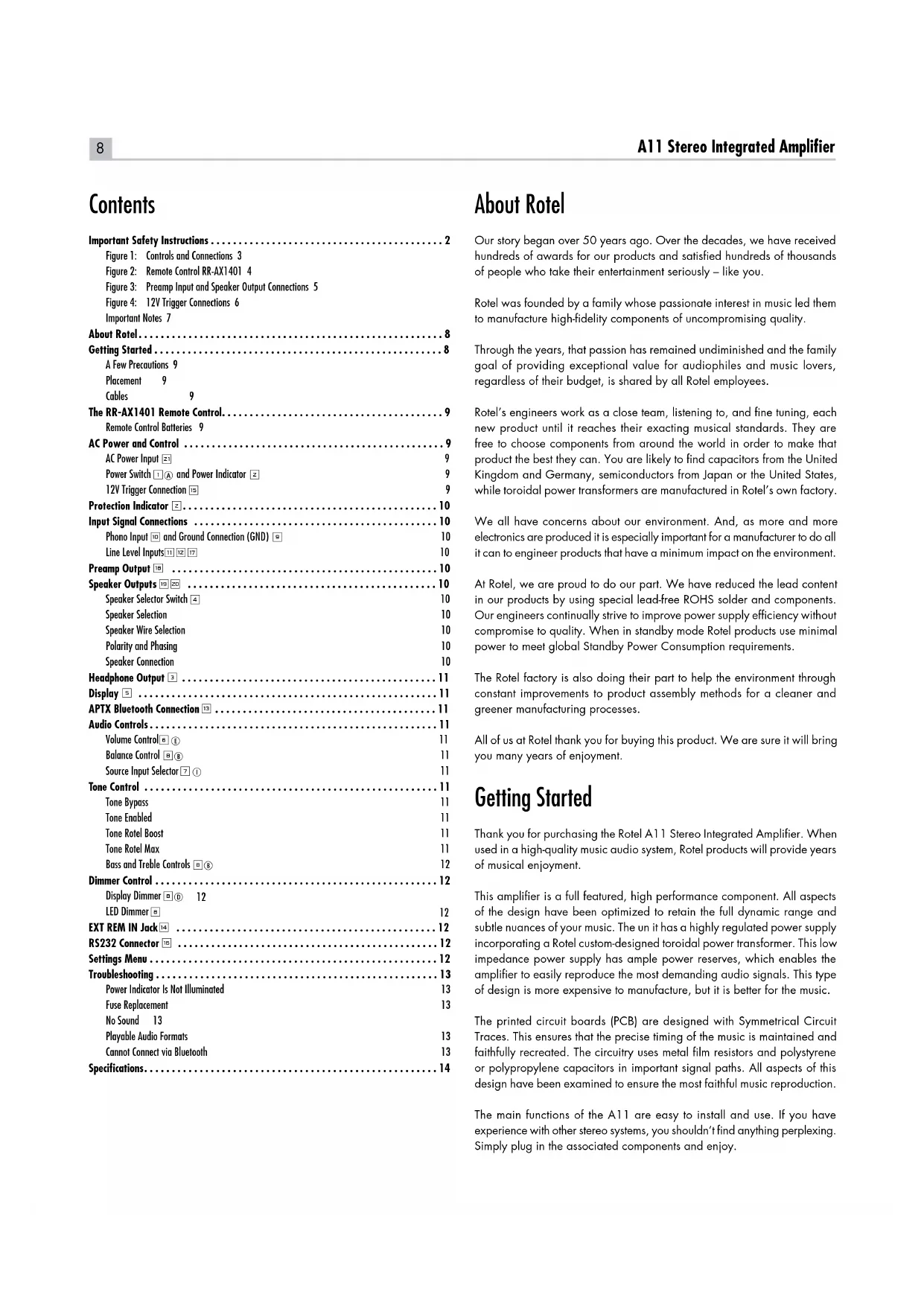 - FACTORY RESET: This sets the unit back to the original state as when it left the factory. Press the + button on the front panel or the ENT button on the remote control to enter factory reset setting. And then press the + button or ENT again to begin reset, or press the MENU button to cancel. NOTE: All previously configured options will be erased and reset to the factory default settings. Troubleshooting Most difculties in audio systems are the result of incorrect connections, or improper control settings. If you encounter problems, isolate the area of the difculty, check the control settings, determine the cause of the fault and make the necessary changes. If you are unable to get sound from the unit, refer to the suggestions for the following conditions: Power Indicator Is Not Illuminated The Power Indicator and the basic items in the Display window should be illuminated whenever the unit is plugged into the wall power outlet and the Power button is pushed in. If it does not illuminated, test the power outlet with another electrical device, such as a lamp. Be sure the power outlet being used is not controlled by a switch that has been turned off. Fuse Replacement If another electrical device works when plugged into the power outlet, but the Power Indicator still will not illuminated when the unit is plugged into the wall outlet, it indicates that the internal power fuse may have blown. If you believe this has happened, contact your authorized Rotel dealer to get the fuse replaced. No Sound Check the signal source to see if it is functioning properly. Make sure the cables from the signal source to the amplier inputs are connected properly. Be sure the Input Source is set to the proper input. Check the wiring between the amplier and the speakers. Playable Audio Formats APTX Bluetooth Format NotesAny format supported by the sending device.May exclude Apps designed to play formats not originally supported by the sending device. Cannot Connect via Bluetooth If you cannot pair your Bluetooth enabled device to the A11, delete the memory of the previous connection on your device. On your device this is often listed as “Forget this Device”. Then try to make the connection again.14 A11 Stereo Integrated Amplier Specications Continuous Power Output 50 watts/ch (20 - 20k Hz, < 0.03%, 8 ohms) Total Harmonic Distortion (20 Hz - 20k Hz, 8 ohms) < 0.03% Intermodulation Distortion (60 Hz : 7k Hz, 4:1) < 0.03% Frequency Response Phono Input 20 Hz - 20k Hz, ± 0.5 dB Line Level Inputs 10 Hz - 100k Hz, ± 0.5 dB Damping Factor (20 - 20,000 Hz, 8 ohms) 140 Input Sensitivity / Impedance Phono Input 2.3 mV / 47k Ohms Line Level Inputs 180 mV / 47k Ohms Input Overload Phono Input 50 mV Line Level Inputs 4 V Preamp Output / Impedance 1 V / 470 Ohms Tone Controls - Bass / Treble ± 10 dB at 100 Hz / 10k Hz Signal to Noise Ratio (A weighting) Phono Input 85 dB Line Level Inputs 100 dB General Power Requirements USA 120V, 60 Hz EC 230V, 50 Hz Standby Power Consumption < 0.5W Power Consumption 160 Watts BTU (4 ohms, 1/8th power) 479 BTU/h Dimensions (W, H, D) 430 x 93 x 345 mm 17” x 3