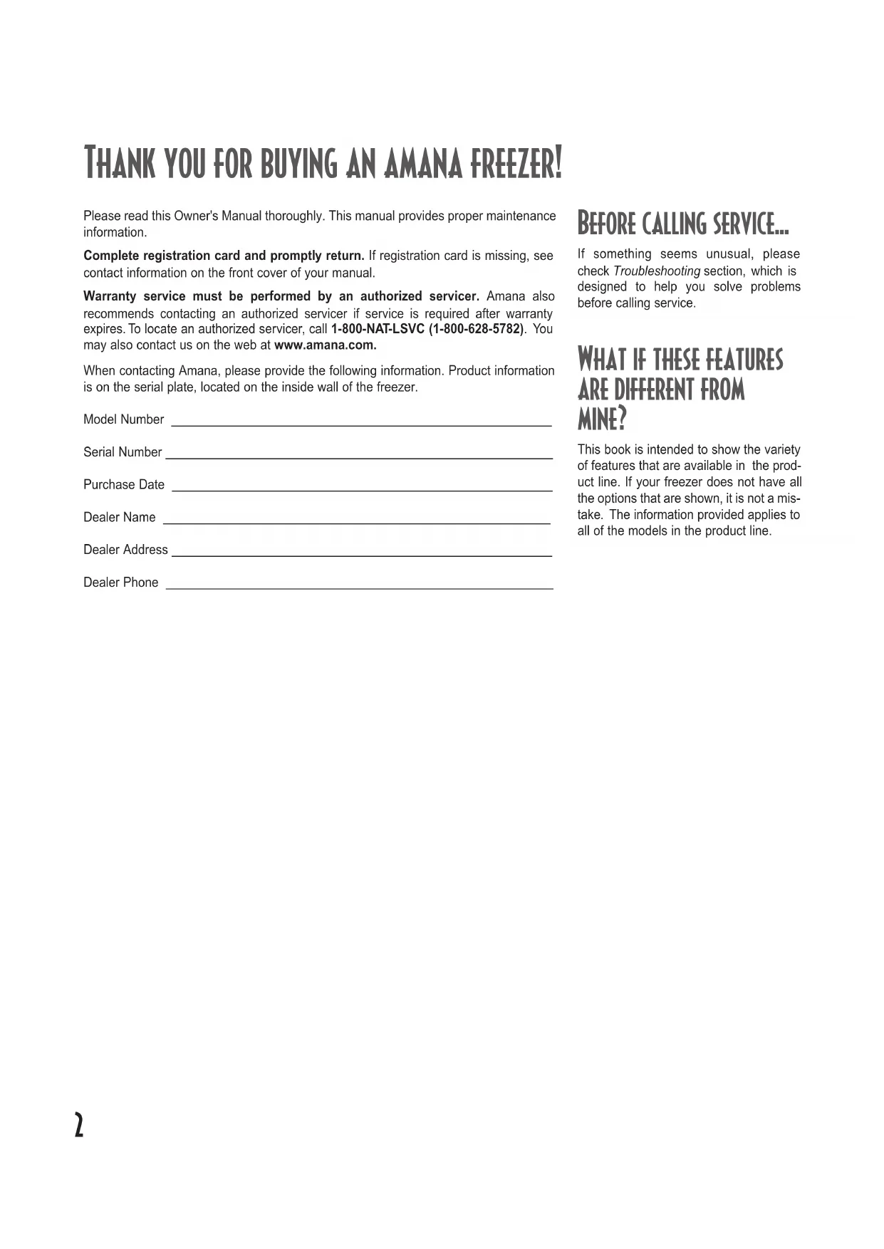 - Man ual del Usuario Thank you for buying an amana freezer! Please read this Owner's Manual thoroughly. This manual provides proper maintenance information. Complete registration card and promptly return. If registration card is missing, see contact information on the front cover of your manual. Warranty service must be performed by an authorized servicer. Amana also recommends contacting an authorized servicer if service is required after warranty expires. To locate an authorized servicer, call 1-800-NAT-LSVC (1-800-628-5782).You may also contact us on the web at www.amana.com. When contacting Amana, please provide the following information. Product information is on the serial plate, located on the inside wall of the freezer. Model Number ________________________________________________________ Serial Number _________________________________________________________ Purchase Date ________________________________________________________ Dealer Name _________________________________________________________ Dealer Address ________________________________________________________ Dealer Phone _________________________________________________________ Before calling service If something seems unusual, please check Troubleshooting section, which is designed to help you solve problems before calling service. What if these features are different from mine? This book is intended to show the variety of features that are available in the prod- uct line. If your freezer does not have all the options that are shown, it is not a mis- take. The information provided applies to all of the models in the product line.3 Important safety information What you need to know about safety instructions Warning and Important Safety Instructions appearing in this manual are not meant to cover all possible conditions and situations that may occur. Common sense, caution, and care must be exercised when installing, maintaining, or operating this freezer. Always contact your dealer, distributor, service agent, or manufacturer about problems or conditions you do not under- stand. Save these instructions DANGER – Immediate hazards which WILL result in severe personal injury or death. DANGER WARNING – Hazards or unsafe prac- tices which COULD result in severe personal injury or death. WARNING CAUTION – Hazards or unsafe prac- tices which COULD result in minor personal injury. CAUTION To reduce risk of injury or death, follow basic precautions, including the following: IMPORTANT: Child entrapment and suffocation are not problems of the past. Junked or abandoned freezers are still dangerous – even if they sit out for “just a few days.” If you are getting rid of your old freezer, please follow the instructions below to help prevent accidents. Before you throw away your old freezer: p. 332