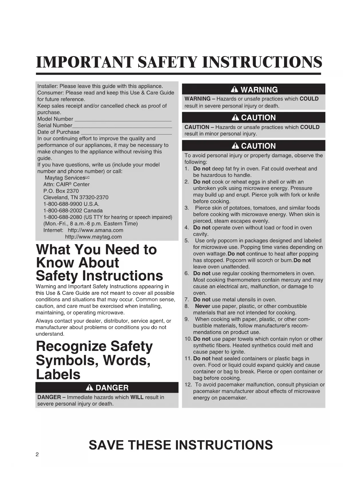 Center P.O. Box 2370 Cleveland, TN 37320-2370 1-800-688-9900 U.S.A. 1-800-688-2002 Canada 1-800-688-2080 (US TTY for hearing or speech impaired) (Mon.-Fri., 8 a.m.-8 p.m. Eastern Time) Internet: http://www.amana.com http://www.maytag.com What You Need to Know About Safety Instructions Warning and Important Safety Instructions appearing in this Use & Care Guide are not meant to cover all possible conditions and situations that may occur. Common sense, caution, and care must be exercised when installing, maintaining, or operating microwave. Always contact your dealer, distributor, service agent, or manufacturer about problems or conditions you do not understand. Recognize Safety Symbols, Words, Labels DANGER DANGER – Immediate hazards which WILL result in severe personal injury or death. WARNING WARNING – Hazards or unsafe practices which COULD result in severe personal injury or death. CAUTION CAUTION – Hazards or unsafe practices which COULD result in minor personal injury. CAUTION To avoid personal injury or property damage, observe the following: