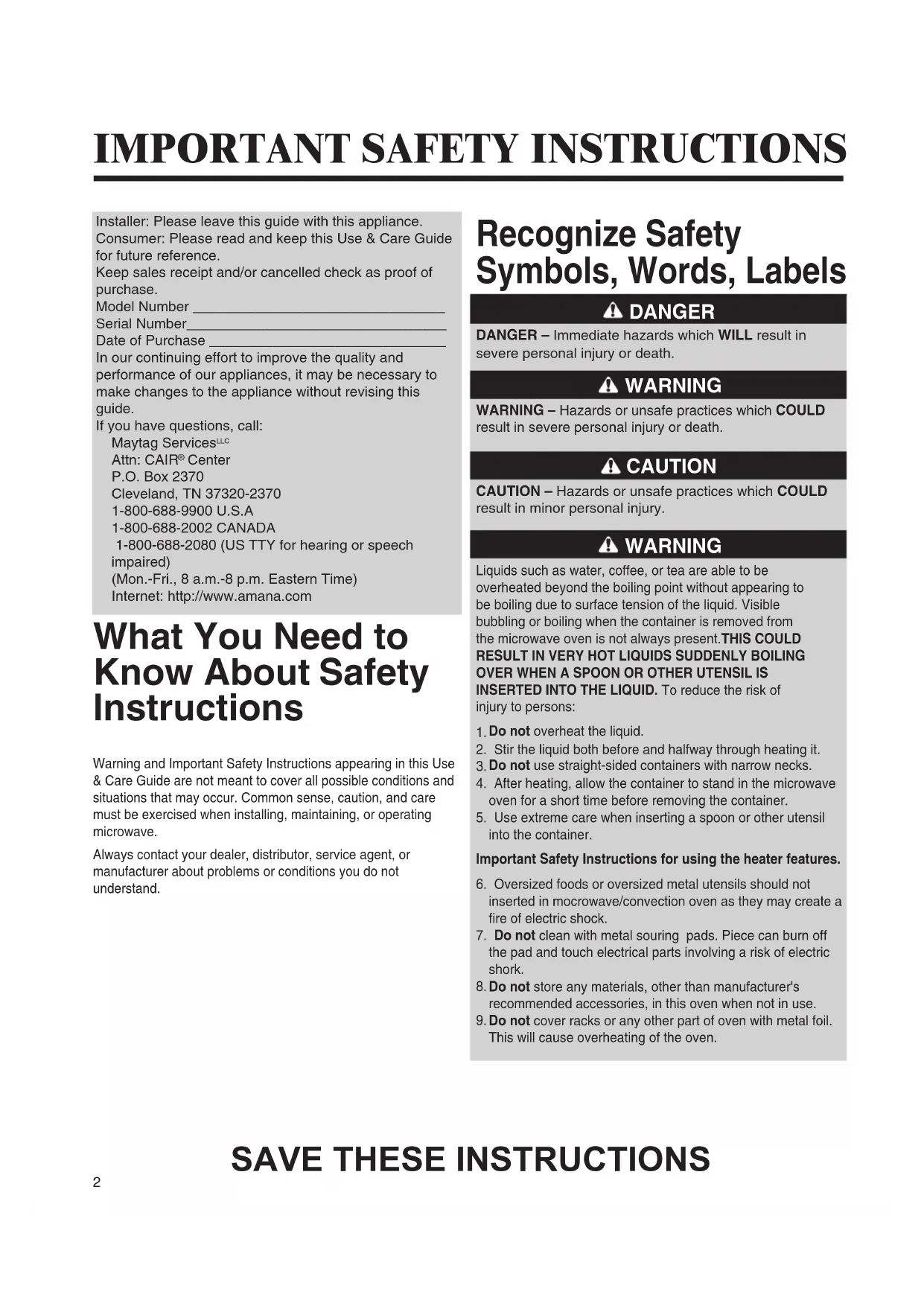 1-800-688-2080 (US TTY for hearing or speech impaired) (Mon.-Fri., 8 a.m.-8 p.m. Eastern Time) Internet: http://www.amana.com What You Need to Know About Safety Instructions Warning and Important Safety Instructions appearing in this Use & Care Guide are not meant to cover all possible conditions and situations that may occur. Common sense, caution, and care must be exercised when installing, maintaining, or operating microwave. Always contact your dealer, distributor, service agent, or manufacturer about problems or conditions you do not understand. Recognize Safety Symbols, Words, Labels DANGER DANGER – Immediate hazards which WILL result in severe personal injury or death. WARNING WARNING – Hazards or unsafe practices which COULD result in severe personal injury or death. CAUTION CAUTION – Hazards or unsafe practices which COULD result in minor personal injury. WARNING Liquids such as water, coffee, or tea are able to be overheated beyond the boiling point without appearing to be boiling due to surface tension of the liquid. Visible bubbling or boiling when the container is removed from the microwave oven is not always present. THIS COULD RESULT IN VERY HOT LIQUIDS SUDDENLY BOILING OVER WHEN A SPOON OR OTHER UTENSIL IS INSERTED INTO THE LIQUID. To reduce the risk of injury to p ersons: