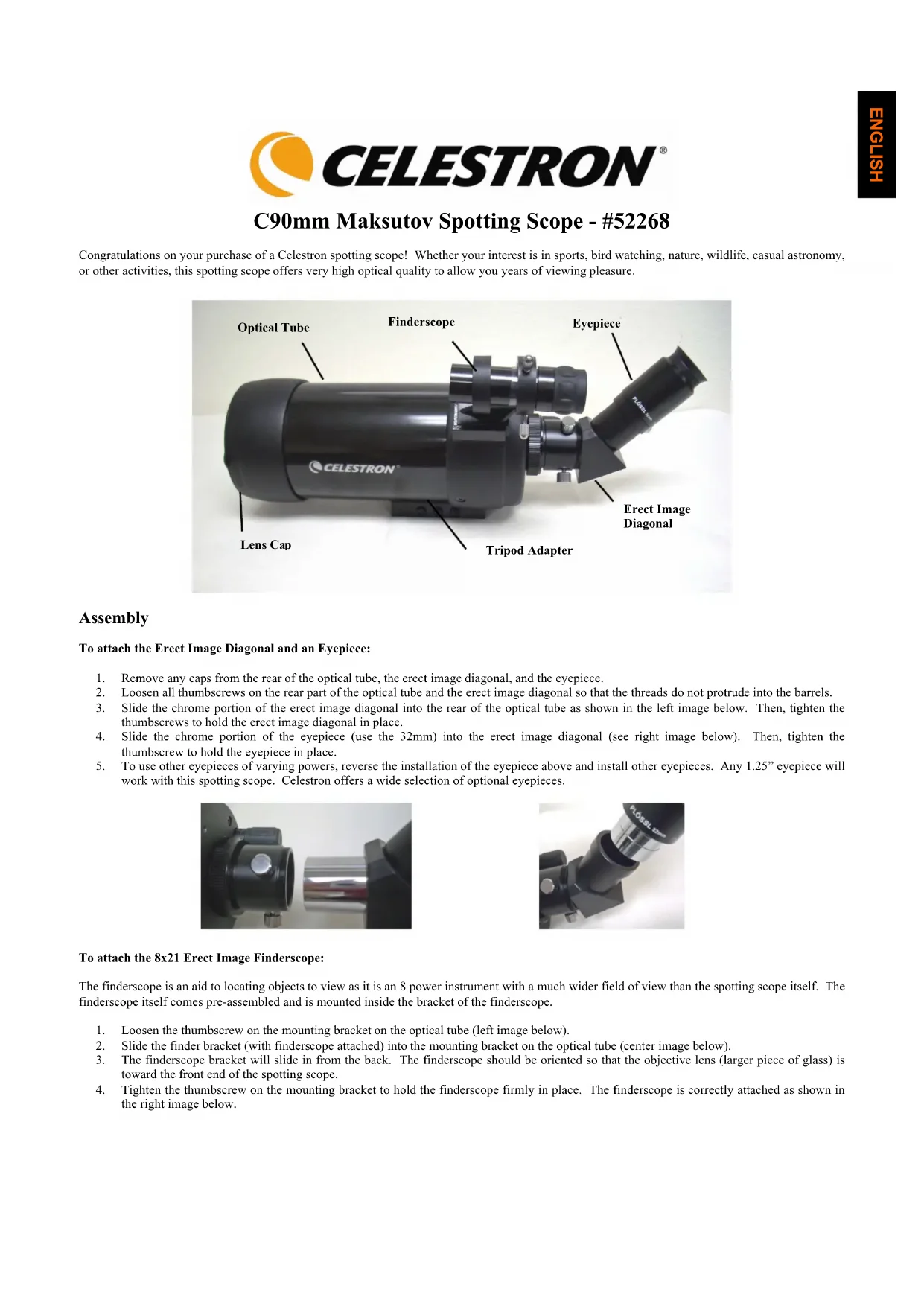 C90mm Maksutov Spotting Scope - #52268 Congratulations on your purchase of a Celestron spotting scope! Whether your interest is in sports, bird watching, nature, wildlife, casual astronomy, or other activities, this spotting scope offers very high optical quality to allow you years of viewing pleasure.