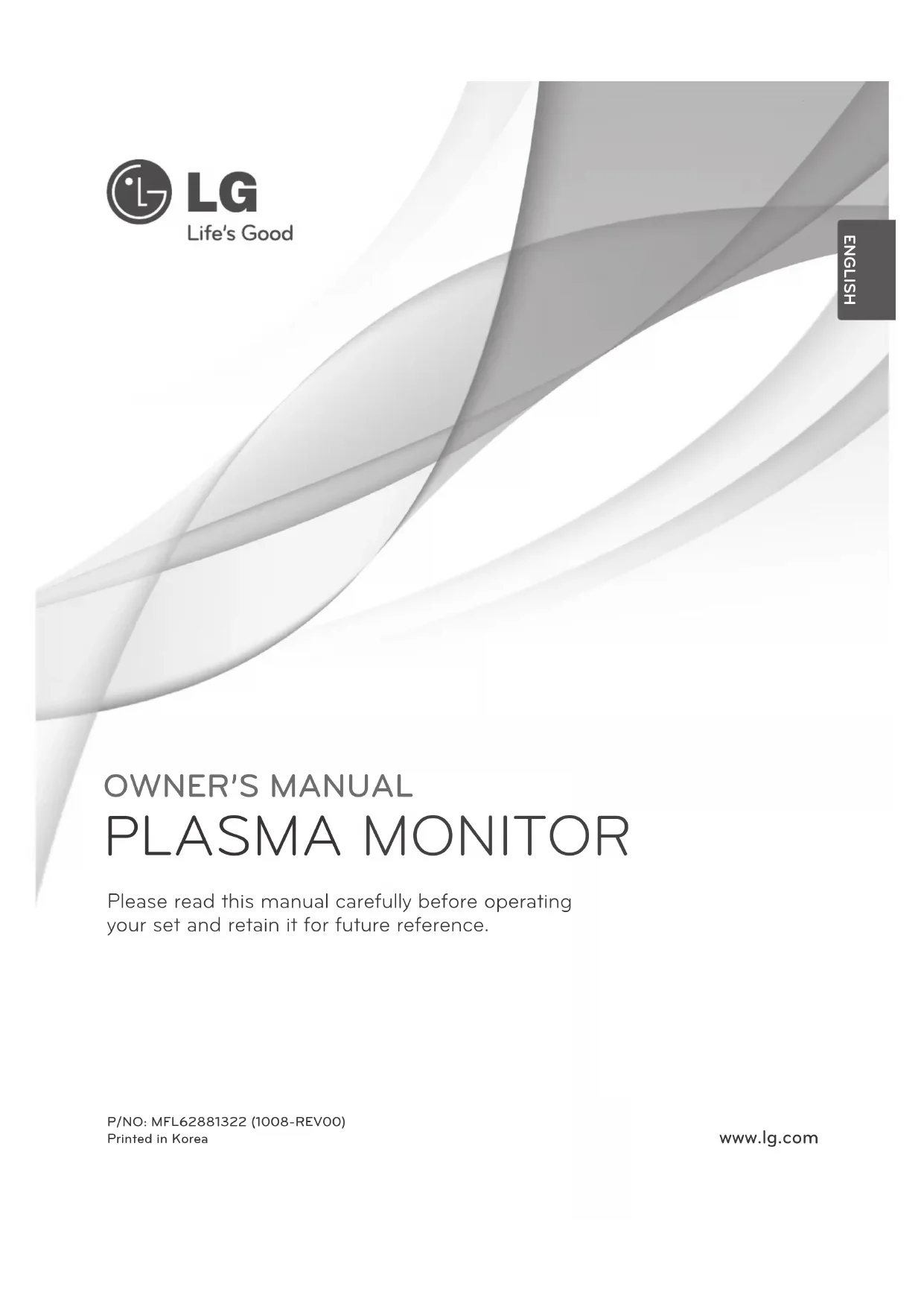 PLASMA MONITOR Please read this manual carefully before operating your set and retain it for future reference. P/NO: MFL62881322 (1008-REV00)Printed in Korea ENGLISH2 WARNING / CAUTION WARNING / CAUTION The lightning flash with arrowhead symbol, within an equilateral trian- gle, is intended to alert the user to the presence of uninsulated “dangerous voltage” within the product’s enclosure that may be of sufficient magnitude to constitute a risk of electric shock to persons. The exclamation point within an equi- lateral triangle is intended to alert the user to the presence of important operat- ing and maintenance (servicing) instructions in the literature accompanying the appliance.