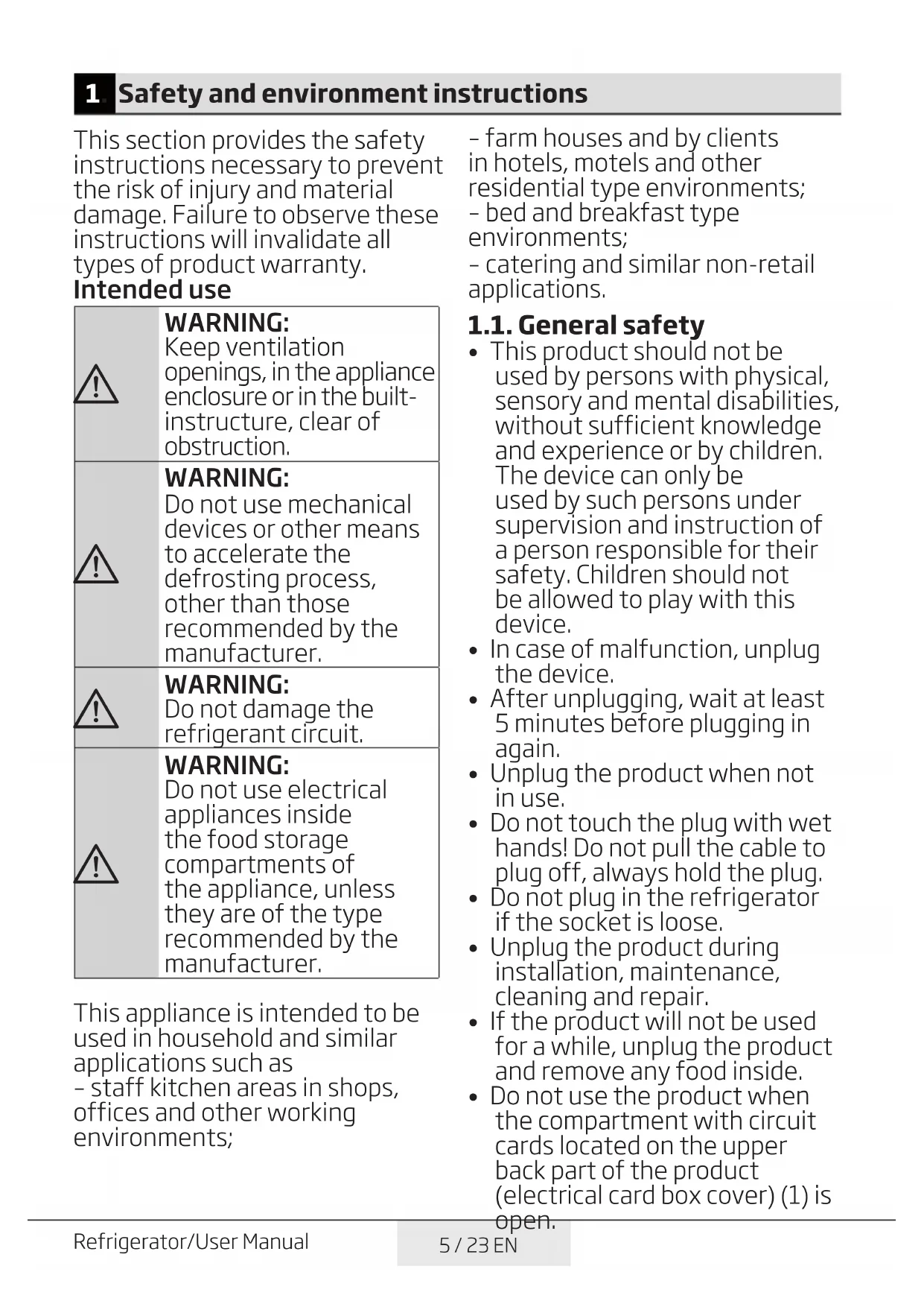 - Do not use the product when the compartment with circuit cards located on the upper back part of the product (electrical card box cover) (1) is open.6 / 23 EN Refrigerator/User Manual Safety and environment instructions