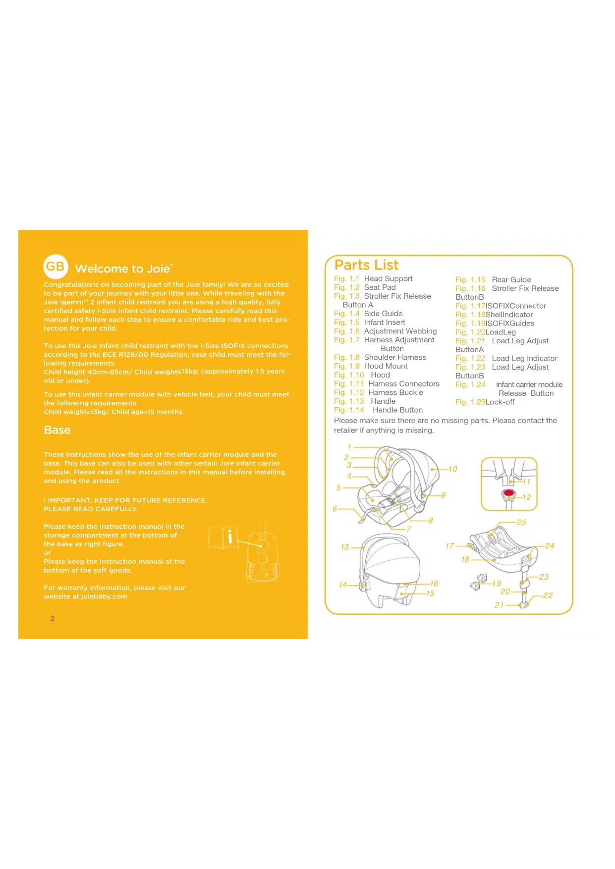 Congratulations on becoming part of the Joie family! We are so excited to be part of your journey with your little one. While traveling with the Joie igemm™ 2 infant child restraint you are using a high quality, fully certified safety i-Size infant child restraint. Please carefully read this manual and follow each step to ensure a comfortable ride and best pro-tection for your child.To use this Joie infant child restraint with the i-Size ISOFIX connections according to the ECE R129/00 Regulation, your child must meet the fol-lowing requirements.Child height 40cm-85cm/ Child weight13kg; (approximately 1.5 years old or under).To use this infant carrier module with vehicle belt, your child must meet the following requirements. Child weight≤13kg/ Child age≤15 months. Base These instructions show the use of the infant carrier module and the base. This base can also be used with other certain Joie infant carrier module. Please read all the instructions in this manual before installing and using the product.! IMPORTANT: KEEP FOR FUTURE REFERENCE. PLEASE READ CAREFULLY.Please keep the instruction manual in the storage compartment at the bottom of the base as right figure. Please keep the instruction manual at thebottom of the soft goods.For warranty information, please visit our website at joiebaby.com3 4 WARNING WARNING ! Please check before you purchase this infant child restraint to make sure it can be installed properly in your vehicle. ! NO infant child restraint can guarantee full protection from injury in an accident. However, proper use of this infant child restraint will reduce the risk of serious injury or death to your child. ! To use this infant child restraint with the ISOFIX connections ac- cording to the ECE R129/00 Regulation, your child must meet the following requirements. Child height 40cm-85cm/ Child weight≤13kg (approximately 1.5 years old or under). ! To use this infant carrier module with vehicle belt, your child must meet the following requirements. Child weight≤13kg/ Child age≤15 months. ! Any straps of infant child restraint should be tightened and not twisted. ! DO NOT install this infant child restraint without following the in- structions in this manual or you may put your child at serious risk of injury or death. ! NEVER leave your child unattended with this infant child restraint. ! DO NOT make any modification to this infant child restraint or use it along with component parts from other manufacturers. ! DO NOT use this infant child restraint if it has damaged or missing parts. ! DO NOT have your child in large/oversized clothes because this may prevent your child from being properly and securely fastened by the shoulder harness straps and the crotch strap between the legs. ! DO NOT leave this infant child restraint or other items unbelted or unsecured in your vehicle because an unsecured infant child restraint can be thrown around and may injure occupants in a sharp turn, sudden stop, or collision. ! DO NOT place a rear-facing infant child restraint on front seat with air bag. Death or serious injury may occur. Please reference vehicle owner’s manual for more information. ! NEVER use a second-hand infant child restraint or an infant child restraint whose history you do not know because it may have struc- tural damage that compromises your child’s safety. ! NEVER use ropes or any other substitutes to secure infant child restraint in vehicle or to secure child into infant child restraint. ! DO NOT use this infant child restraint without the soft goods. ! The soft goods should not be replaced with any besides the ones recommended by the manufacturer. The soft goods constitute an integral part of the infant child restraint performance. ! DO NOT put anything other than the recommended inner cushions in this infant child restraint. ! Be sure that the infant child restraint is installed in such a way that no part of it interferes with movable seats or in the operation of vehicle doors. ! DO NOT continue to use this infant child restraint after it has suffered any type of crash, even a minor one. Replace immediately as there may be invisible, structural damage from the crash. ! Remove this infant carrier module and base from the vehicle seat when it is not in regular use. ! Consult the distributor for issues concerning maintenance, repair and part replacement. ! To avoid the risk of falling out, always secure the child using the child harness when the child is placed in infant carrier module, even when the infant child restraint is not in the vehicle. ! Before carrying the infant carrier module by hand, ensure that the child is fastened with the child harness, and that the handle is cor- rectly locked in a vertical position. ! To avoid serious injury or death, NEVER place infant carrier module on elevated surface seat with child in it. ! The parts of this infant child restraint should not be lubricated in any way. ! Always secure child in infant child restraint, even on short trips, as this is when most accidents occur. ! DO NOT use this infant child restraint for more than 5 years after the purchase date as parts may degrade over time, or from exposure to sunlight, and may not perform adequately in a crash. ! Please keep this infant child restraint away from sunlight, because it may be too hot for child’s skin. Always touch the infant child restraint before placing child in it.5 6 WARNING Figure for Installation Child height 40cm-85cm/ Child weight≤13kg (approximately 1.5 years old or under) Suitable for Child weight≤13kg Child age≤15 months Product Information " i-Size" (Integral Universal ISOFIX Child Restraint Systems) is a category of Infant Child Restraint System for use in all i-Size seating position of a vehicle. Not all vehicle manufacture's handbooks list i-Size compatibility yet. This seat and base is also approved for use in ISOFIX compatible vehicles. Please refer to the vehicle manufacturer's website or consult your dealer.