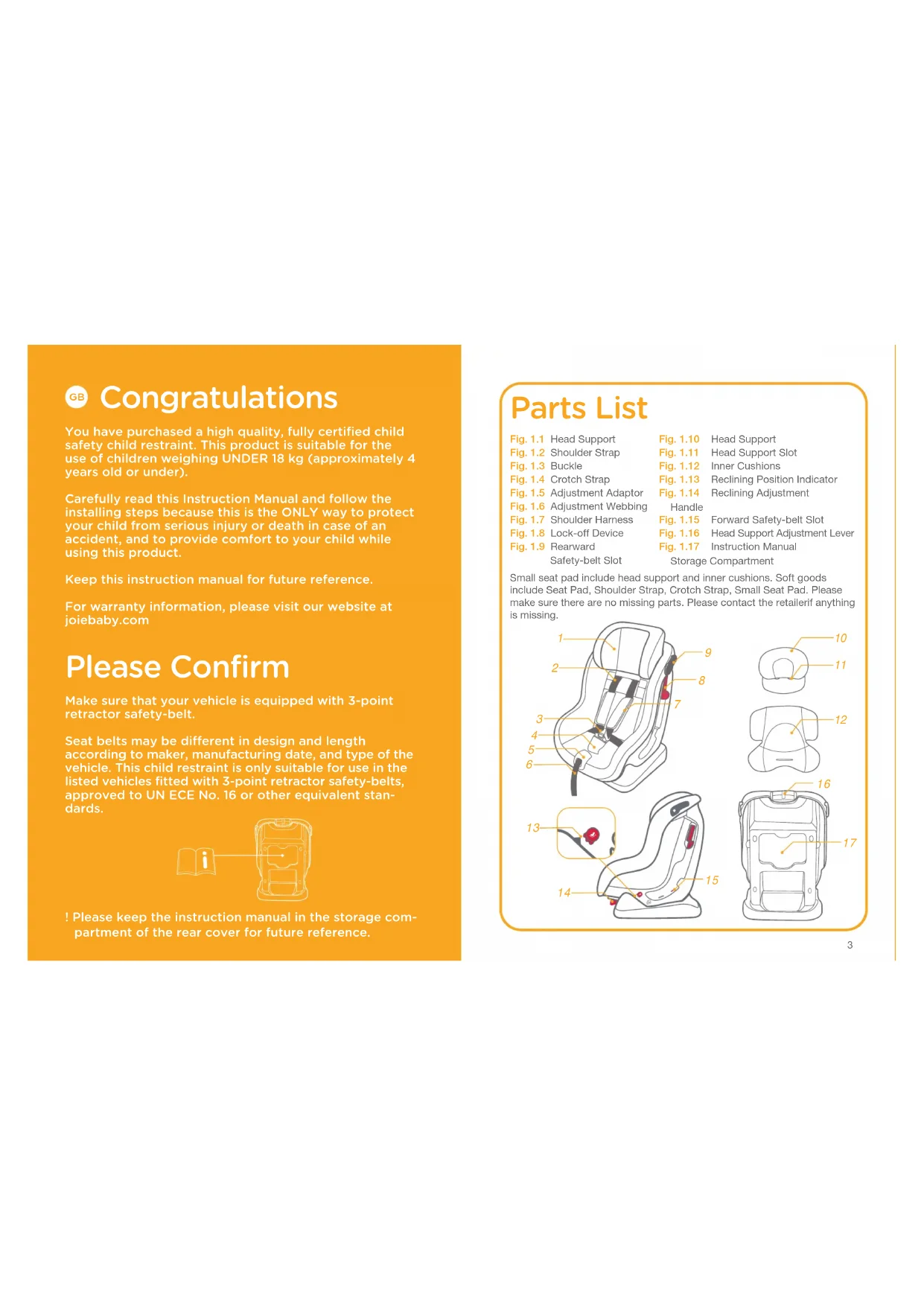 Parts List Small seat pad include head support and inner cushions. Soft goods include Seat Pad, Shoulder Strap, Crotch Strap, Small Seat Pad. Please make sure there are no missing parts. Please contact the retailerif anything is missing. Fig. 1.1 Head Support Fig. 1.2 Shoulder Strap Fig. 1.3 Buckle Fig. 1.4 Crotch Strap Fig. 1.5 Adjustment Adaptor Fig. 1.6 Adjustment Webbing Fig. 1.7 Shoulder Harness Fig. 1.8 Lock-off Device Fig. 1.9 Rearward Safety-belt Slot Fig. 1.10 Head Support Fig. 1.11 Head Support Slot Fig. 1.12 Inner Cushions Fig. 1.13 Reclining Position Indicator Fig. 1.14 Reclining Adjustment Handle Fig. 1.15 Forward Safety-belt Slot Fig. 1.16 Head Support Adjustment Lever Fig. 1.17 Instruction Manual Storage Compartment