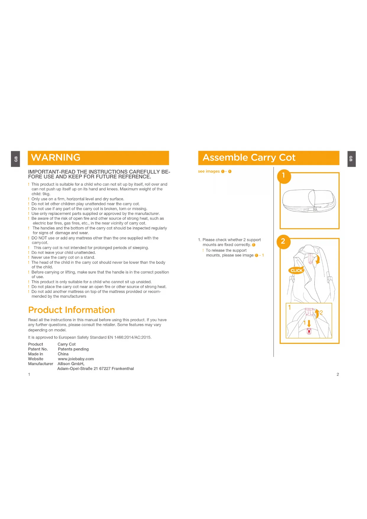 WARNING IMPORTANT-READ THE INSTRUCTIONS CAREFULLY BE-FORE USE AND KEEP FOR FUTURE REFERENCE.! This product is suitable for a child who can not sit up by itself, roll over and can not push up itself up on its hand and knees. Maximum weight of the child: 9kg.! Only use on a firm, horizontal level and dry surface.! Do not let other children play unattended near the carry cot.! Do not use if any part of the carry cot is broken, torn or missing.! Use only replacement parts supplied or approved by the manufacturer.! Be aware of the risk of open fire and other source of strong heat, such as electric bar fires, gas fires, etc., in the near vicinity of carry cot.! The handles and the bottom of the carry cot should be inspected regularly for signs of damage and wear.! DO NOT use or add any mattress other than the one supplied with the carry cot.! This carry cot is not intended for prolonged periods of sleeping.! Do not leave your child unattended.! Never use the carry cot on a stand.! The head of the child in the carry cot should never be lower than the body of the child. ! Before carrying or lifting, make sure that the handle is in the correct position of use.! This product is only suitable for a child who cannot sit up unaided.! Do not place the carry cot near an open fire or other source of strong heat.! Do not add another mattress on top of the mattress provided or recom-mended by the manufacturers Product Information Read all the instructions in this manual before using this product. If you have any further questions, please consult the retailer. Some features may vary depending on model.It is approved to European Safety Standard EN 1466:2014/AC:2015. Product Carry CotPatent No. Patents pendingMade in ChinaWebsite www.joiebaby.comManufacturer Allison GmbH, Adam-Opel-Straße 21 67227 Frankenthal Assemble Carry Cot