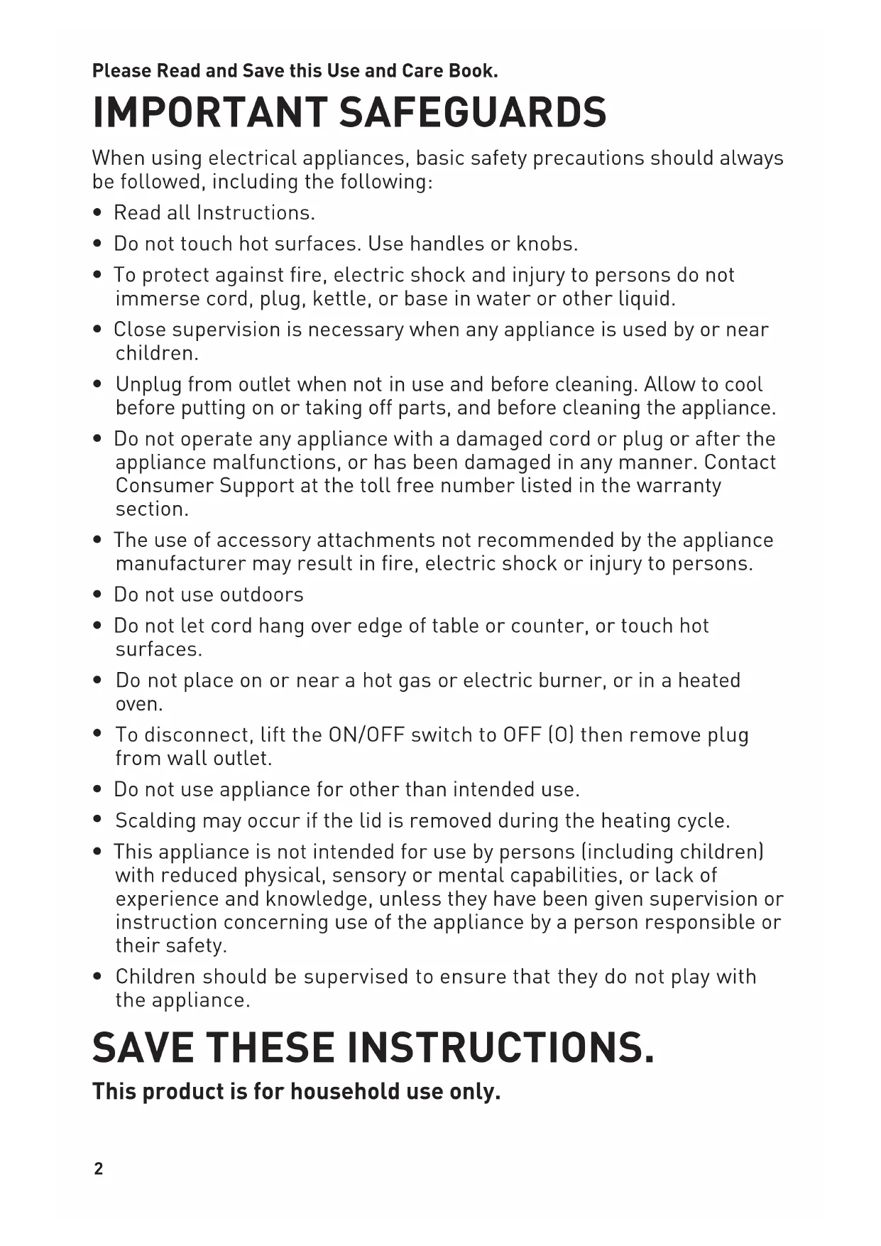 † 12. Water level tabs (inside kettle) (Part# KE2900-04) (not shown) Note: † indicates consumer replaceable/removable parts5 How to Use This appliance is for household use only.