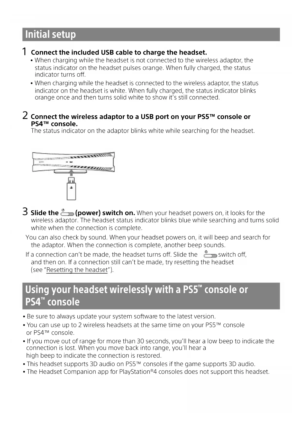 Connect the included USB cable to charge the headset. ˎ When charging while the headset is not connected to the wireless adaptor, the status indicator on the headset pulses orange. When fully charged, the status indicator turns off. ˎ When charging while the headset is connected to the wireless adaptor, the status indicator on the headset is white. When fully charged, the status indicator blinks orange once and then turns solid white to show it’s still connected. 2 Connect the wireless adaptor to a USB port on your PS5™ console or PS4™ console. The status indicator on the adaptor blinks white while searching for the headset. 3 Slide the (power) switch on. When your headset powers on, it looks for the wireless adaptor. The headset status indicator blinks blue while searching and turns solid white when the connection is complete. You can also check by sound. When your headset powers on, it will beep and search for the adaptor. When the connection is complete, another beep sounds. If a connection can’t be made, the headset turns off. Slide the switch off, and then on. If a connection still can’t be made, try resetting the headset (see “Resetting the headset”). Using your headset wirelessly with a PS5