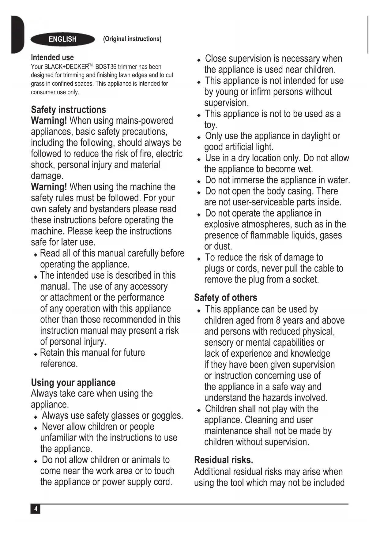 ENGLISH (Original instructions) Intended use Your BLACK+DECKER TM, BDST36 trimmer has been designed for trimming and nishing lawn edges and to cut grass in conned spaces. This appliance is intended for consumer use only. Safety instructions Warning! When using mains-powered appliances, basic safety precautions, including the following, should always be followed to reduce the risk of re, electric shock, personal injury and material damage. Warning! When using the machine the safety rules must be followed. For your own safety and bystanders please read these instructions before operating the machine. Please keep the instructions safe for later use. u Read all of this manual carefully before operating the appliance. u The intended use is described in this manual. The use of any accessory or attachment or the performance of any operation with this appliance other than those recommended in this instruction manual may present a risk of personal injury. u Retain this manual for future reference. Using your appliance Always take care when using the appliance. uAlways use safety glasses or goggles. uNever allow children or people unfamiliar with the instructions to use the appliance. uDo not allow children or animals to come near the work area or to touch the appliance or power supply cord. uClose supervision is necessary when the appliance is used near children. uThis appliance is not intended for use by young or inrm persons without supervision. uThis appliance is not to be used as a toy. uOnly use the appliance in daylight or good articial light. uUse in a dry location only. Do not allow the appliance to become wet. uDo not immerse the appliance in water. uDo not open the body casing. There are not user-serviceable parts inside. uDo not operate the appliance in explosive atmospheres, such as in the presence of ammable liquids, gases or dust. uTo reduce the risk of damage to plugs or cords, never pull the cable to remove the plug from a socket. Safety of others uThis appliance can be used by children aged from 8 years and above and persons with reduced physical, sensory or mental capabilities or lack of experience and knowledge if they have been given supervision or instruction concerning use of the appliance in a safe way and understand the hazards involved. uChildren shall not play with the appliance. Cleaning and user maintenance shall not be made by children without supervision. Residual risks. Additional residual risks may arise when using the tool which may not be included5 ENGLISH (Original instructions) in the enclosed safety warnings. These risks can arise from misuse, prolonged use etc. Even with the application of the relevant safety regulations and the implementation of safety devices, certain residual risks can not be avoided. These include: uInjuries caused by touching any rotating/moving parts. uInjuries caused when changing any parts, blades or accessories. uInjuries caused by prolonged use of a tool. When using any tool for prolonged periods ensure you take regular breaks. uImpairment of hearing. uHealth hazards caused by breathing dust developed when using your tool (example:- working with wood, especially oak, beech and MDF.) After use uWhen not in use, the appliance should be stored in a dry, well ventilated place out of reach of children. uChildren should not have access to stored appliances. uWhen the appliance is stored or transported in a vehicle it should be placed in the boot or restrained to prevent movement following sudden changes in speed or direction. Inspection and repairs uBefore use, check the appliance for damaged or defective parts. Check for breakage of parts and any other conditions that may affect its operation. uDo not use the appliance if any part is damaged or defective. uHave any damaged or defective parts repaired or replaced by an authorised repair agent. uNever attempt to remove or replace any parts other than those specied in this manual. Using an extension cable Always use an approved extension cable suitable for the power input of this appliance (see technical data). The extension cable must be suitable for outdoor use and marked accordingly. Up to 30 m of 1.5 mm
