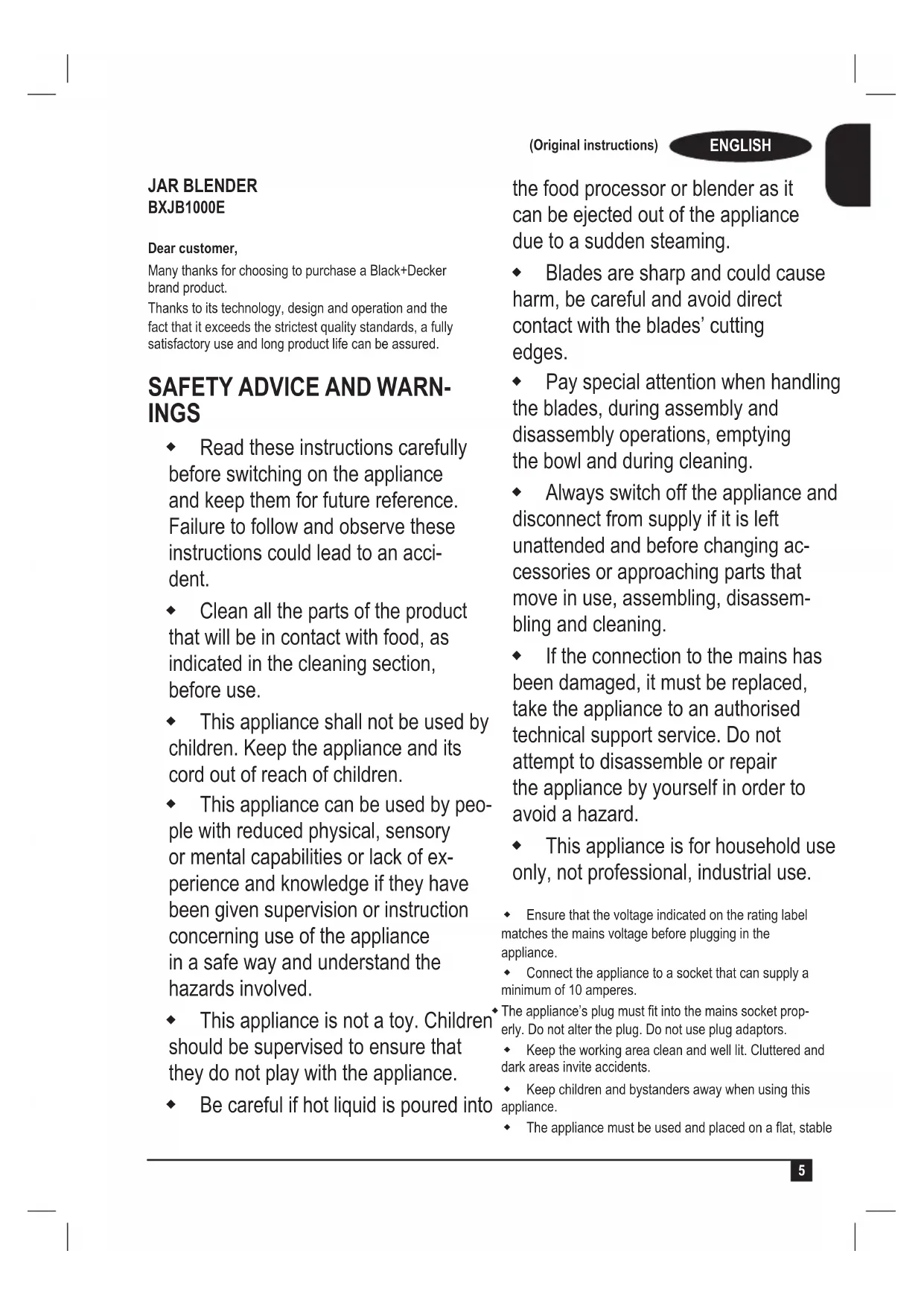 JAR BLENDER BXJB1000E Dear customer, Many thanks for choosing to purchase a Black+Decker brand product. Thanks to its technology, design and operation and the fact that it exceeds the strictest quality standards, a fully satisfactory use and long product life can be assured.