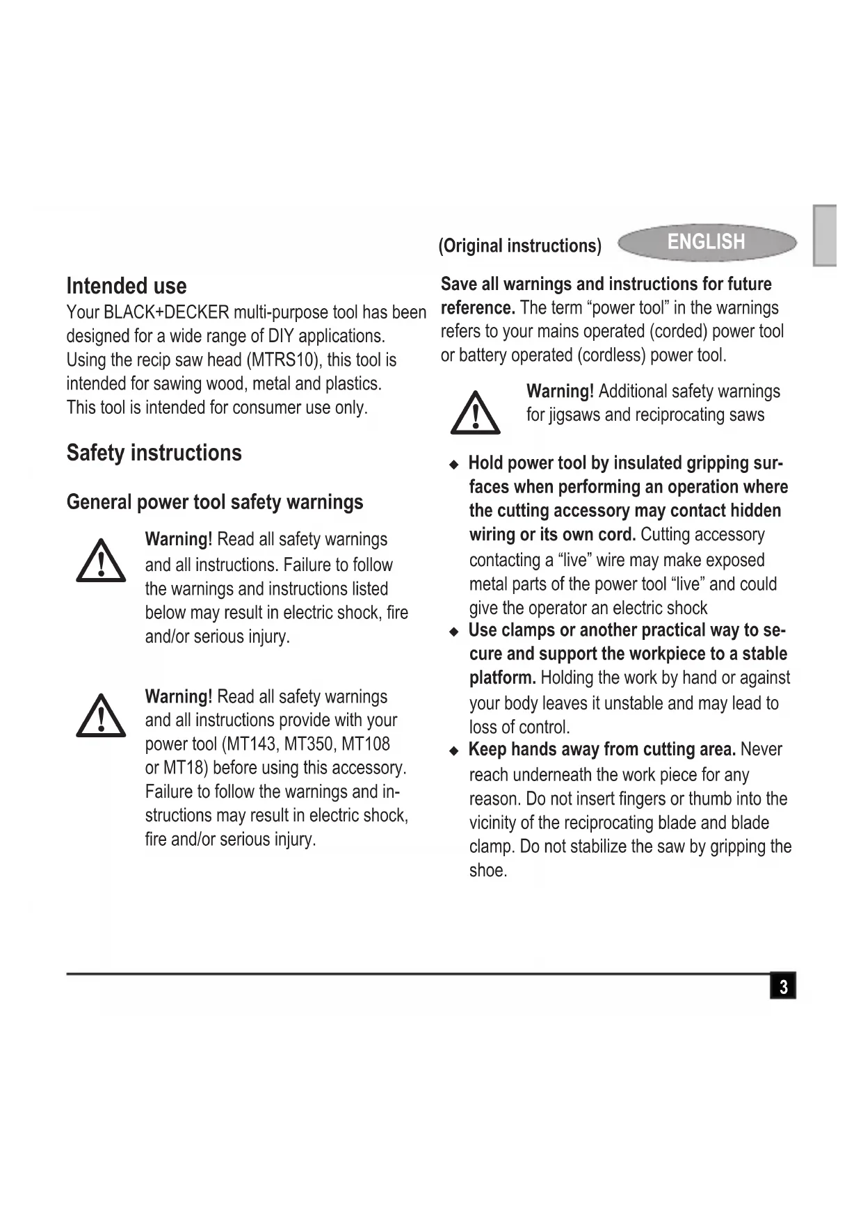 ENGLISH (Original instructions) Intended use Your BLACK+DECKER multi-purpose tool has been designed for a wide range of DIY applications. Using the recip saw head (MTRS10), this tool is intended for sawing wood, metal and plastics. This tool is intended for consumer use only. Safety instructions General power tool safety warnings