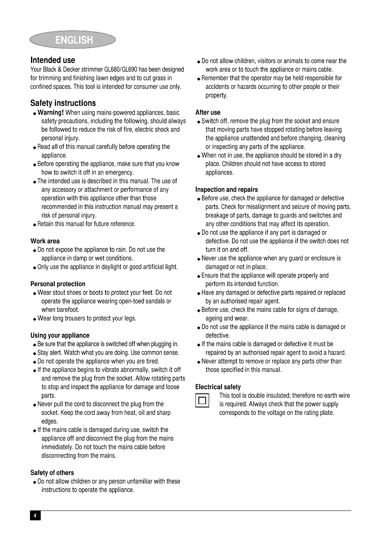 ENGLISH Intended use Your Black & Decker strimmer GL680/GL690 has been designed for trimming and finishing lawn edges and to cut grass in confined spaces. This tool is intended for consumer use only. Safety instructions ◆ Warning! When using mains-powered appliances, basic safety precautions, including the following, should always be followed to reduce the risk of fire, electric shock and personal injury. ◆ Read all of this manual carefully before operating the appliance. ◆ Before operating the appliance, make sure that you know how to switch it off in an emergency. ◆ The intended use is described in this manual. The use of any accessory or attachment or performance of any operation with this appliance other than those recommended in this instruction manual may present a risk of personal injury. ◆ Retain this manual for future reference. Work area ◆ Do not expose the appliance to rain. Do not use the appliance in damp or wet conditions. ◆ Only use the appliance in daylight or good artificial light. Personal protection ◆ Wear stout shoes or boots to protect your feet. Do not operate the appliance wearing open-toed sandals or when barefoot. ◆ Wear long trousers to protect your legs. Using your appliance ◆ Be sure that the appliance is switched off when plugging in. ◆ Stay alert. Watch what you are doing. Use common sense. ◆ Do not operate the appliance when you are tired. ◆ If the appliance begins to vibrate abnormally, switch it off and remove the plug from the socket. Allow rotating parts to stop and inspect the appliance for damage and loose parts. ◆ Never pull the cord to disconnect the plug from the socket. Keep the cord away from heat, oil and sharp edges. ◆ If the mains cable is damaged during use, switch the appliance off and disconnect the plug from the mains immediately. Do not touch the mains cable before disconnecting from the mains. Safety of others ◆ Do not allow children or any person unfamiliar with these instructions to operate the appliance. ◆ Do not allow children, visitors or animals to come near the work area or to touch the appliance or mains cable. ◆ Remember that the operator may be held responsible for accidents or hazards occurring to other people or their property. After use ◆ Switch off, remove the plug from the socket and ensure that moving parts have stopped rotating before leaving the appliance unattended and before changing, cleaning or inspecting any parts of the appliance. ◆ When not in use, the appliance should be stored in a dry place. Children should not have access to stored appliances. Inspection and repairs ◆ Before use, check the appliance for damaged or defective parts. Check for misalignment and seizure of moving parts, breakage of parts, damage to guards and switches and any other conditions that may affect its operation. ◆ Do not use the appliance if any part is damaged or defective. Do not use the appliance if the switch does not turn it on and off. ◆ Never use the appliance when any guard or enclosure is damaged or not in place. ◆ Ensure that the appliance will operate properly and perform its intended function. ◆ Have any damaged or defective parts repaired or replaced by an authorised repair agent. ◆ Before use, check the mains cable for signs of damage, ageing and wear. ◆ Do not use the appliance if the mains cable is damaged or defective. ◆ If the mains cable is damaged or defective it must be repaired by an authorised repair agent to avoid a hazard. ◆ Never attempt to remove or replace any parts other than those specified in this manual. Electrical safety This tool is double insulated; therefore no earth wire is required. Always check that the power supply corresponds to the voltage on the rating plate.5 ENGLISH Additional safety instructions for grass trimmers The following warning symbols are found on the appliance: Read the manual prior to operation. Wear safety glasses or goggles when operating this tool. 360˚