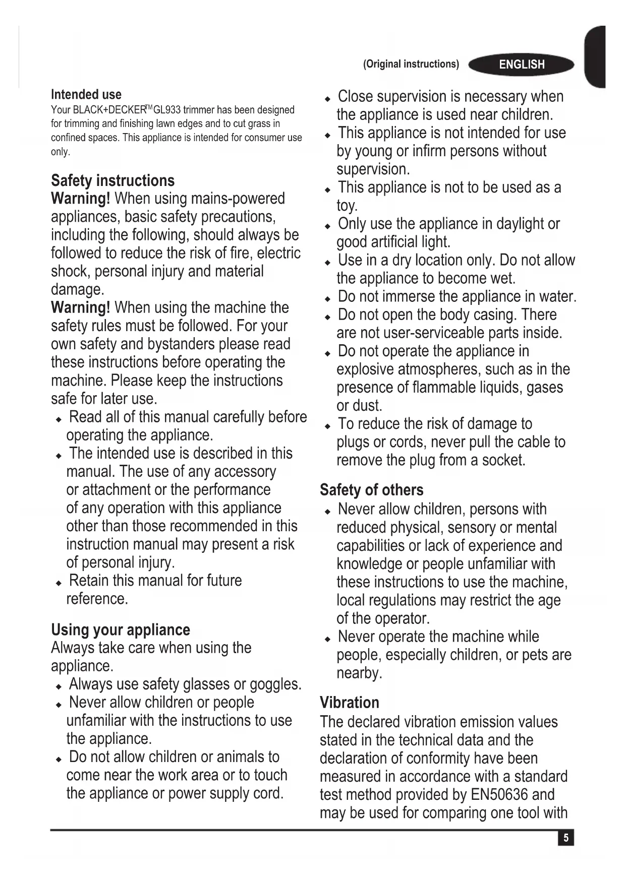 GL933 trimmer has been designed for trimming and nishing lawn edges and to cut grass in conned spaces. This appliance is intended for consumer use only. Safety instructions Warning! When using mains-powered appliances, basic safety precautions, including the following, should always be followed to reduce the risk of re, electric shock, personal injury and material damage. Warning! When using the machine the safety rules must be followed. For your own safety and bystanders please read these instructions before operating the machine. Please keep the instructions safe for later use. uRead all of this manual carefully before operating the appliance. uThe intended use is described in this manual. The use of any accessory or attachment or the performance of any operation with this appliance other than those recommended in this instruction manual may present a risk of personal injury. uRetain this manual for future reference. Using your appliance Always take care when using the appliance. uAlways use safety glasses or goggles. uNever allow children or people unfamiliar with the instructions to use the appliance. uDo not allow children or animals to come near the work area or to touch the appliance or power supply cord. uClose supervision is necessary when the appliance is used near children. uThis appliance is not intended for use by young or inrm persons without supervision. uThis appliance is not to be used as a toy. uOnly use the appliance in daylight or good articial light. uUse in a dry location only. Do not allow the appliance to become wet. uDo not immerse the appliance in water. uDo not open the body casing. There are not user-serviceable parts inside. uDo not operate the appliance in explosive atmospheres, such as in the presence of ammable liquids, gases or dust. uTo reduce the risk of damage to plugs or cords, never pull the cable to remove the plug from a socket. Safety of others uNever allow children, persons with reduced physical, sensory or mental capabilities or lack of experience and knowledge or people unfamiliar with these instructions to use the machine, local regulations may restrict the age of the operator. uNever operate the machine while people, especially children, or pets are nearby. Vibration The declared vibration emission values stated in the technical data and the declaration of conformity have been measured in accordance with a standard test method provided by EN50636 and may be used for comparing one tool with6 ENGLISH (Original instructions) another. The declared vibration emission value may also be used in a preliminary assessment of exposure. Warning! The vibration emission value during actual use of the power tool can differ from the declared value depending on the ways in which the tool is used. The vibration level may increase above the level stated. When assessing vibration exposure to determine safety measures required by 2002/44/EC to protect persons regularly using power tools in employment, an estimation of vibration exposure should consider, the actual conditions of use and the way the tool is used, including taking account of all parts of the operating cycle such as the times when the tool is switched off and when it is running idle in addition to the trigger time. Residual risks. Additional residual risks may arise when using the tool which may not be included in the enclosed safety warnings. These risks can arise from misuse, prolonged use etc. Even with the application of the relevant safety regulations and the implementation of safety devices, certain residual risks can not be avoided. These include: uInjuries caused by touching any rotating/moving parts. uInjuries caused when changing any parts, blades or accessories. uInjuries caused by prolonged use of a tool. When using any tool for prolonged periods ensure you take regular breaks. uImpairment of hearing. uHealth hazards caused by breathing dust developed when using your tool (example:- working with wood, especially oak, beech and MDF.) After use uWhen not in use, the appliance should be stored in a dry, well ventilated place out of reach of children. uChildren should not have access to stored appliances. uWhen the appliance is stored or transported in a vehicle it should be placed in the boot or restrained to prevent movement following sudden changes in speed or direction. Inspection and repairs uDisconnect the machine from the mains before checking, cleaning or working on the machine and when it is in use. uBefore use, check the appliance for damaged or defective parts. Check for breakage of parts and any other conditions that may affect its operation. uDo not use the appliance if any part is damaged or defective. uHave any damaged or defective parts repaired or replaced by an authorised repair agent. uNever attempt to remove or replace any parts other than those specied in this manual. Using an extension cable Always use an approved extension cable suitable for the power input of this appliance (see technical data). The extension cable must be suitable for7 ENGLISH (Original instructions) outdoor use and marked accordingly. Up to 30 m of 1.5 mm