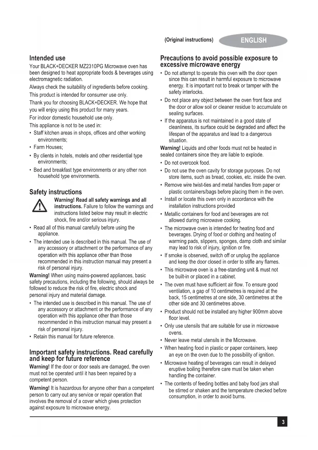 ENGLISH (Original instructions) Intended use Your BLACK+DECKER MZ2310PG Microwave oven has been designed to heat appropriate foods & beverages using electromagnetic radiation. Always check the suitability of ingredients before cooking. This product is intended for consumer use only. Thank you for choosing BLACK+DECKER. We hope that you will enjoy using this product for many years. For indoor domestic household use only. This appliance is not to be used in: