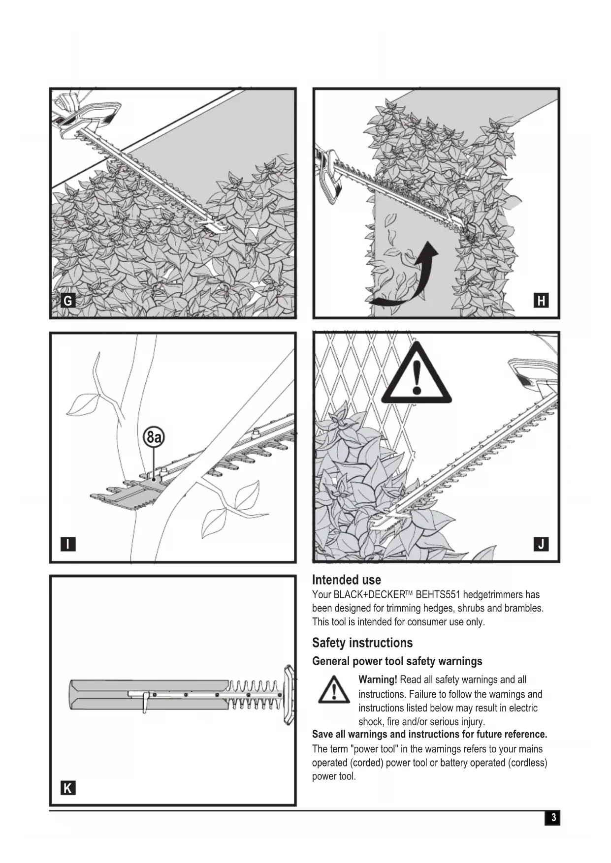 BEHTS551 hedgetrimmers has been designed for trimming hedges, shrubs and brambles. This tool is intended for consumer use only. Safety instructions General power tool safety warnings Warning! Read all safety warnings and all instructions. Failure to follow the warnings and instructions listed below may result in electric shock, re and/or serious injury. Save all warnings and instructions for future reference. The term "power tool" in the warnings refers to your mains operated (corded) power tool or battery operated (cordless) power tool.4 ENGLISH (Original instructions)