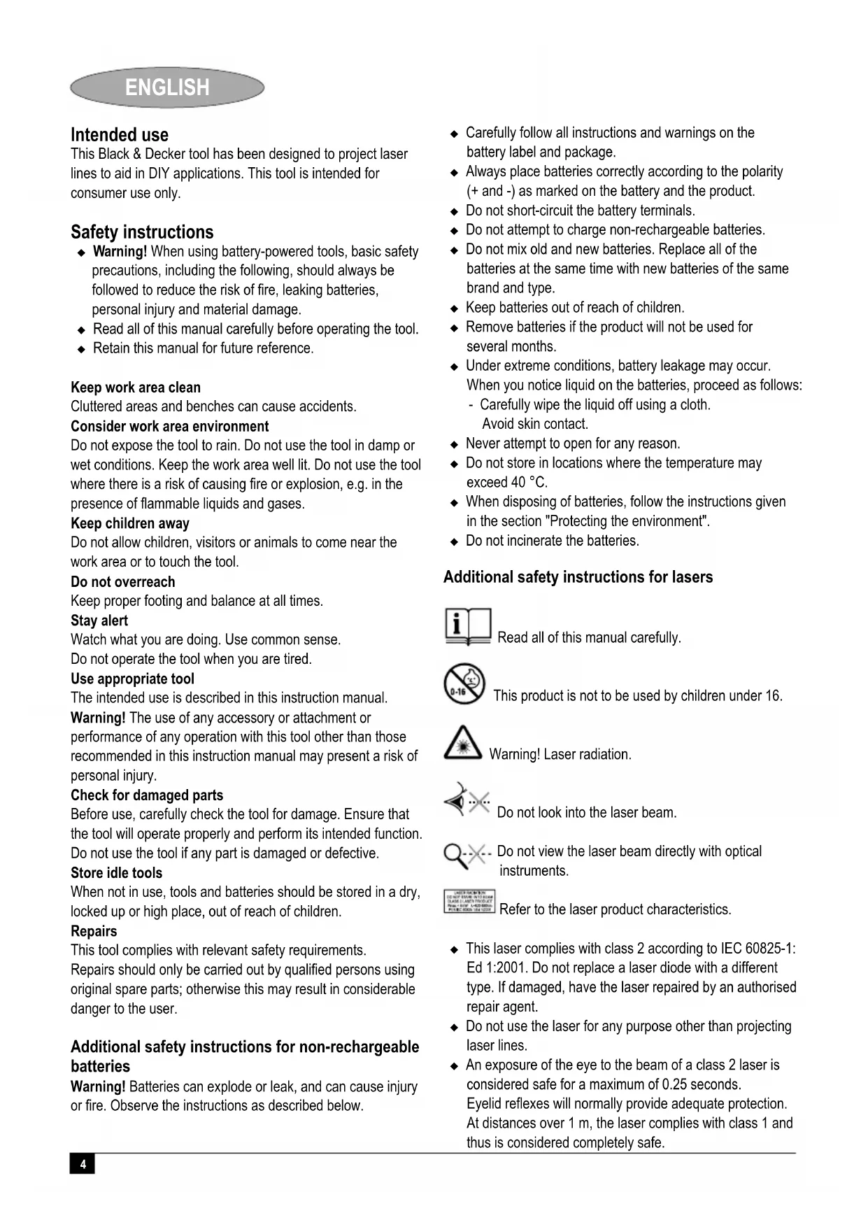 ENGLISH Intended use This Black & Decker tool has been designed to project laser lines to aid in DIY applications. This tool is intended for consumer use only. Safety instructions Warning! When using battery-powered tools, basic safety precautions, including the following, should always be followed to reduce the risk of fire, leaking batteries, personal injury and material damage. Read all of this manual carefully before operating the tool. Retain this manual for future reference. Keep work area clean Cluttered areas and benches can cause accidents. Consider work area environment Do not expose the tool to rain. Do not use the tool in damp or wet conditions. Keep the work area well lit. Do not use the tool where there is a risk of causing fire or explosion, e.g. in the presence of flammable liquids and gases. Keep children away Do not allow children, visitors or animals to come near the work area or to touch the tool. Do not overreach Keep proper footing and balance at all times. Stay alert Watch what you are doing. Use common sense. Do not operate the tool when you are tired. Use appropriate tool The intended use is described in this instruction manual. Warning! The use of any accessory or attachment or performance of any operation with this tool other than those recommended in this instruction manual may present a risk of personal injury. Check for damaged parts Before use, carefully check the tool for damage. Ensure that the tool will operate properly and perform its intended function. Do not use the tool if any part is damaged or defective. Store idle tools When not in use, tools and batteries should be stored in a dry, locked up or high place, out of reach of children. Repairs This tool complies with relevant safety requirements. Repairs should only be carried out by qualified persons using original spare parts; otherwise this may result in considerable danger to the user. Additional safety instructions for non-rechargeable batteries Warning! Batteries can explode or leak, and can cause injury or fire. Observe the instructions as described below. Carefully follow all instructions and warnings on the battery label and package. Always place batteries correctly according to the polarity (+ and -) as marked on the battery and the product. Do not short-circuit the battery terminals. Do not attempt to charge non-rechargeable batteries. Do not mix old and new batteries. Replace all of the batteries at the same time with new batteries of the same brand and type. Keep batteries out of reach of children. Remove batteries if the product will not be used for several months. Under extreme conditions, battery leakage may occur. When you notice liquid on the batteries, proceed as follows: - Carefully wipe the liquid off using a cloth. Avoid skin contact. Never attempt to open for any reason. Do not store in locations where the temperature may exceed 40 °C. When disposing of batteries, follow the instructions given in the section "Protecting the environment". Do not incinerate the batteries. Additional safety instructions for lasers Read all of this manual carefully. This product is not to be used by children under 16. Warning! Laser radiation. Do not look into the laser beam. Do not view the laser beam directly with optical instruments. Refer to the laser product characteristics. This laser complies with class 2 according to IEC 60825-1: Ed 1:2001. Do not replace a laser diode with a different type. If damaged, have the laser repaired by an authorised repair agent. Do not use the laser for any purpose other than projecting laser lines. An exposure of the eye to the beam of a class 2 laser is considered safe for a maximum of 0.25 seconds. Eyelid reflexes will normally provide adequate protection. At distances over 1 m, the laser complies with class 1 and thus is considered completely safe.5 ENGLISH Never look into the laser beam directly and intentionally. Do not use optical tools to view the laser beam. Do not set up the tool at a position where the laser beam can cross any person at head height. Do not let children come near the laser. If the laser line brightness suddenly increases or the projected line becomes distorted this may indicate a broken lens. To prevent a laser hazard the tool must not be used. Use non-rechargeable batteries only. Do not connect the laser to any other type of power source. Features