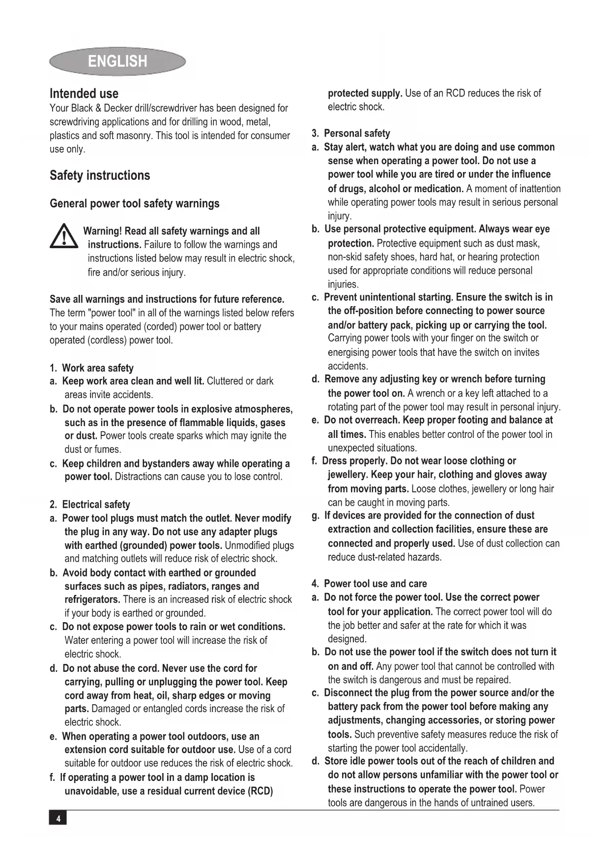a. Do not force the power tool. Use the correct power tool for your application. The correct power tool will do the job better and safer at the rate for which it was designed. b. Do not use the power tool if the switch does not turn it on and off. Any power tool that cannot be controlled with the switch is dangerous and must be repaired. c. Disconnect the plug from the power source and/or the battery pack from the power tool before making any adjustments, changing accessories, or storing power tools. Such preventive safety measures reduce the risk of starting the power tool accidentally. d. Store idle power tools out of the reach of children and do not allow persons unfamiliar with the power tool or these instructions to operate the power tool. Power tools are dangerous in the hands of untrained users. Intended use Your Black & Decker drill/screwdriver has been designed for screwdriving applications and for drilling in wood, metal, plastics and soft masonry. This tool is intended for consumer use only. Safety instructions General power tool safety warnings