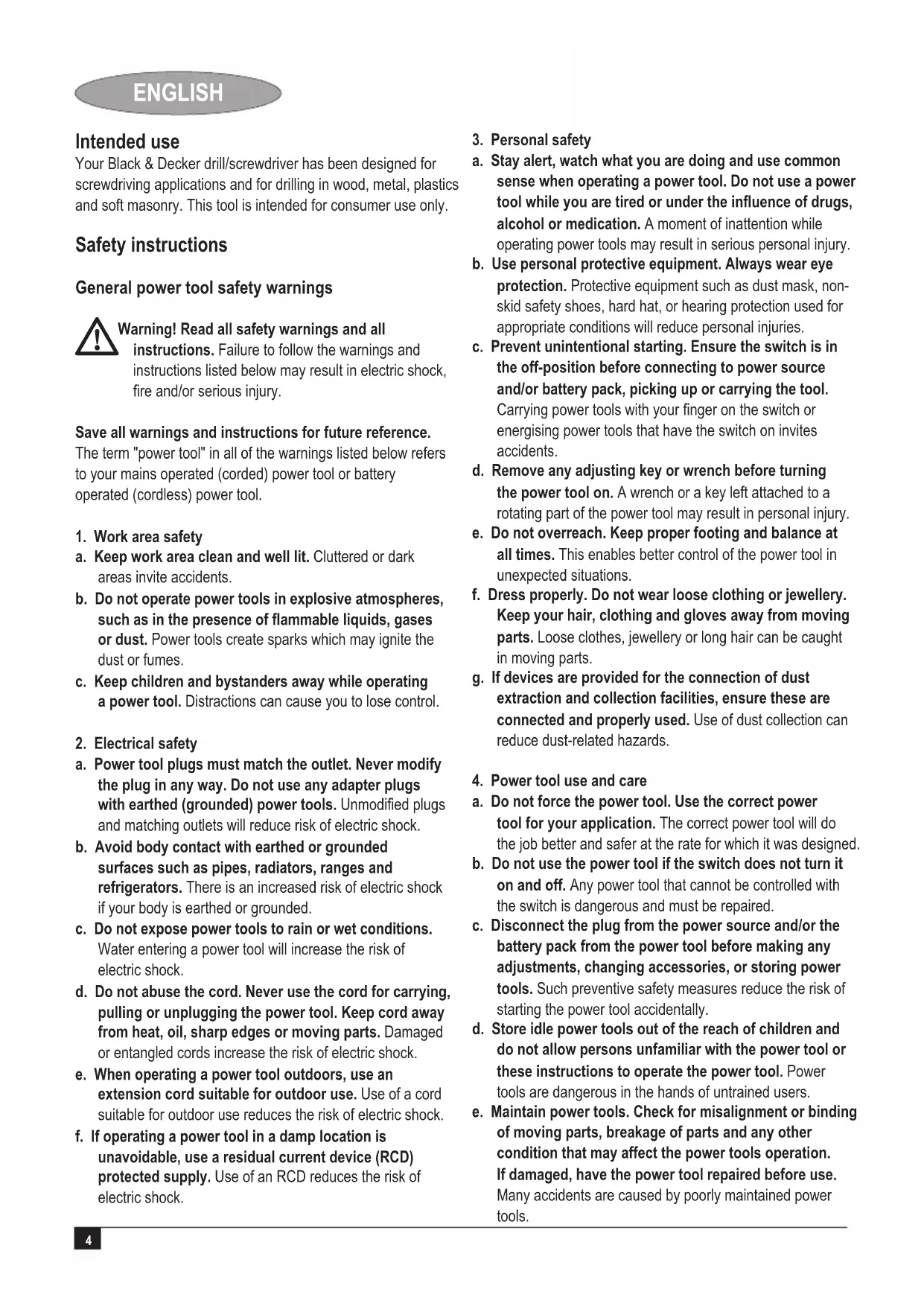 a. Do not force the power tool. Use the correct power tool for your application. The correct power tool will do the job better and safer at the rate for which it was designed. b. Do not use the power tool if the switch does not turn it on and off. Any power tool that cannot be controlled with the switch is dangerous and must be repaired. c. Disconnect the plug from the power source and/or the battery pack from the power tool before making any adjustments, changing accessories, or storing power tools. Such preventive safety measures reduce the risk of starting the power tool accidentally. d. Store idle power tools out of the reach of children and do not allow persons unfamiliar with the power tool or these instructions to operate the power tool. Power tools are dangerous in the hands of untrained users. e. Maintain power tools. Check for misalignment or binding of moving parts, breakage of parts and any other condition that may affect the power tools operation. If damaged, have the power tool repaired before use. Many accidents are caused by poorly maintained power tools. Intended use Your Black & Decker drill/screwdriver has been designed for screwdriving applications and for drilling in wood, metal, plastics and soft masonry. This tool is intended for consumer use only. Safety instructions General power tool safety warnings