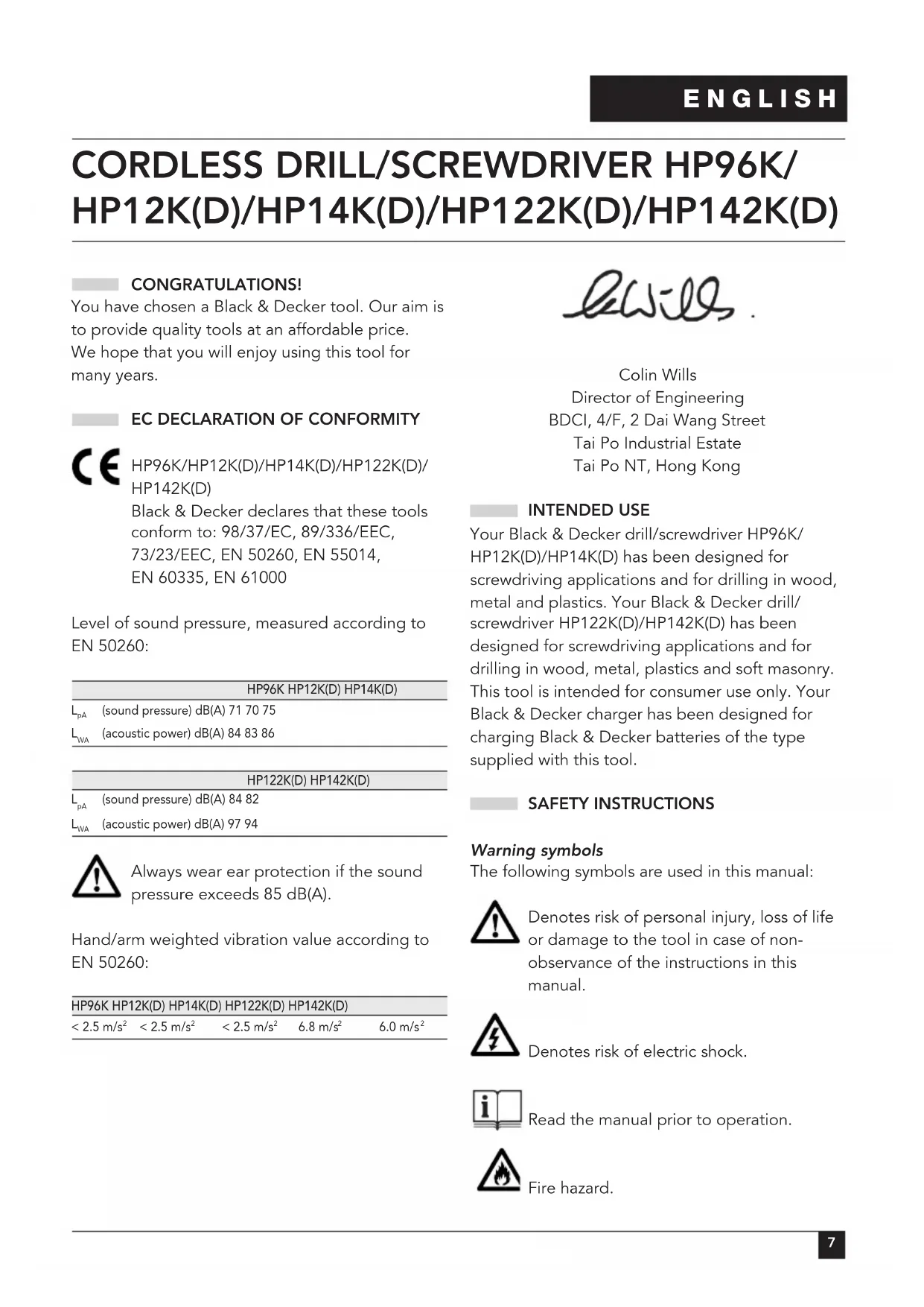 Colin Wills Director of Engineering BDCI, 4/F, 2 Dai Wang Street Tai Po Industrial Estate Tai Po NT, Hong Kong INTENDED USE Your Black & Decker drill/screwdriver HP96K/ HP12K(D)/HP14K(D) has been designed for screwdriving applications and for drilling in wood, metal and plastics. Your Black & Decker drill/ screwdriver HP122K(D)/HP142K(D) has been designed for screwdriving applications and for drilling in wood, metal, plastics and soft masonry. This tool is intended for consumer use only. Your Black & Decker charger has been designed for charging Black & Decker batteries of the type supplied with this tool. SAFETY INSTRUCTIONS Warning symbols The following symbols are used in this manual: Denotes risk of personal injury, loss of life or damage to the tool in case of non- observance of the instructions in this manual. Denotes risk of electric shock. Read the manual prior to operation. Fire hazard. ENGLISH8 Know your tool ◆ Warning! When using battery-powered tools, basic safety precautions, including the following, should always be followed to reduce the risk of fire, leaking batteries, personal injury and material damage. ◆ Read all of this manual carefully before operating the tool. ◆ Before operating the tool, make sure that you know how to switch the tool off in an emergency. ◆ Retain this manual for future reference. General