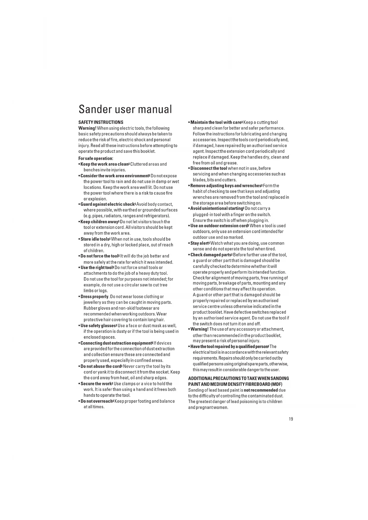PAINT AND MEDIUM DENSITY FIBREBOARD (MDF) Sanding of lead based paint is not recommended due to the difficulty of controlling the contaminated dust. The greatest danger of lead poisoning is to children and pregnant women. Sander user manual20 Any pre-1960 building may have been painted in the past with paint containing lead, and covered by additional layers of paint. It is important to determine whether the paint that is being sanded contains lead before beginning work. This can be done with lead test kits or by a professional decorator. If in doubt, we recommend the following precautions when sanding any paint or MDF. PERSONAL SAFETY No children or pregnant women should enter the work area where the paint sanding is being done until all cleaning up has been completed. A dust mask or respirator should be worn by all persons entering the work area. The filter should be replaced daily or whenever the wearer has difficulty breathing. Note: Only those dust masks suitable for working with lead paint dust and fumes should be used. Ordinary paint masks do not offer this protection. No eating, drinking or smoking should be done in the work area to prevent ingesting paint particles. Workers should wash and clean up before eating, drinking or smoking. Articles of food ,drink etc., should not be left in the work area where dust could settle on them. ENVIRONMENTAL SAFETY Paint should be removed in such a manner as to minimise the amount of dust generated Areas where paint removal is occurring should be sealed with plastic sheeting. Sanding should be done in a manner to reduce tracking of paint dust outside the work area.