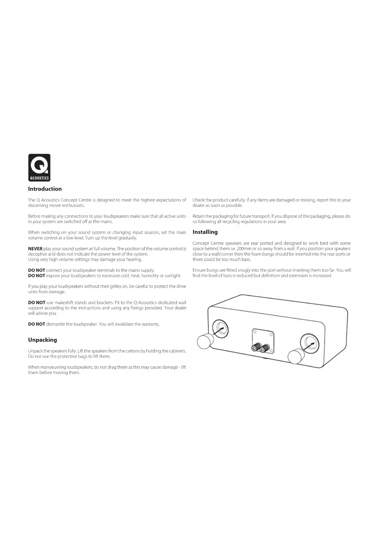 User Manual and Product Specifcations Concept CentreIntroduction The Q Acoustics Concept Centre is designed to meet the highest expectations of discerning movie enthusiasts. Before making any connections to your loudspeakers make sure that all active units in your system are switched o at the mains. When switching on your sound system or changing input sources, set the main volume control at a low level. Turn up the level gradually. NEVER play your sound system at full volume. The position of the volume control is deceptive and does not indicate the power level of the system. Using very high volume settings may damage your hearing. DO NOT connect your loudspeaker terminals to the mains supply. DO NOT expose your loudspeakers to excessive cold, heat, humidity or sunlight. If you play your loudspeakers without their grilles on, be careful to protect the drive units from damage. DO NOT use makeshift stands and brackets. Fit to the Q-Acoustics dedicated wall support according to the instructions and using any xings provided. Your dealer will advise you. DO NOT dismantle the loudspeaker. You will invalidate the warranty. Unpacking Unpack the speakers fully. Lift the speakers from the cartons by holding the cabinets. Do not use the protective bags to lift them. When manoeuvring loudspeakers, do not drag them as this may cause damage - lift them before moving them. Check the product carefully. If any items are damaged or missing, report this to your dealer as soon as possible. Retain the packaging for future transport. If you dispose of the packaging, please do so following all recycling regulations in your area. Installing Concept Centre speakers are rear ported and designed to work best with some space behind them i.e. 200mm or so away from a wall. If you position your speakers close to a wall/corner then the foam bungs should be inserted into the rear ports or there could be too much bass. Ensure bungs are tted snugly into the port without inserting them too far. You will nd the level of bass is reduced but denition and extension is increased.Connecting Specialist loudspeaker cables will oer a higher standard of reproduction than general purpose ‘bell’ or ‘zip’ wire. Use cable with generous amounts of copper. Thin cables reduce the bass and restrict the dynamic range. Speaker cable has a stripe or tracer along one core. By convention this is connected to the positive terminals. The cables connecting the amplier to the front loudspeakers should ideally be the same length. Never join cables - use complete lengths. Preparing Cables Split the cable to a depth of about 40mm. Bare the wire to a depth of 10mm and twist the ends to gather any stray wires. Crop the cable leaving 7mm of bare wire exposed. Connecting a Terminal Unscrew the terminal anticlockwise to expose the mounting hole in the base of the terminal column. Insert the bare end of the cable into the hole. Re- tighten the terminal fully hand tight. Make sure there are no stray wires which could touch adjacent terminals. In the EU it is against safety regulations to use 4mm loudspeaker plugs. Cleaning Clean cabinets with a barely damp cloth. Do not use solvent based cleaning materials. If the cabinets become stained, remove the stain with a cloth lightly moistened with water, white spirit or isopropyl alcohol depending on the stain. Then lightly bu with a cloth to remove any residue of the cleaning agent. Never use abrasives of any kind. Grilles Lightly brush out grilles with a soft brush. Do not remove the speaker grilles unless absolutely necessary. Drive Units Drive units are best left untouched as they are easily damaged when exposed.