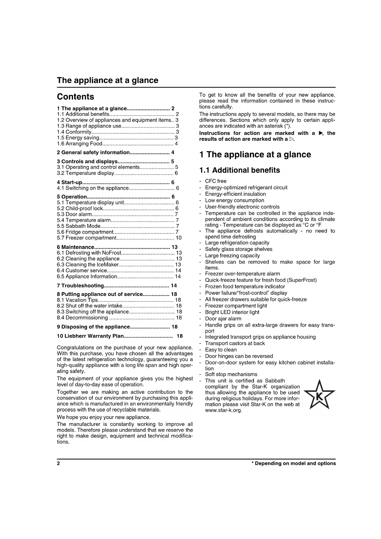 9 Disposing of the appliance........................... 18 10 Liebherr Warranty Plan................................. 18 Congratulations on the purchase of your new appliance. With this purchase, you have chosen all the advantages of the latest refrigeration technology, guaranteeing you a high-quality appliance with a long life span and high oper- ating safety. The equipment of your appliance gives you the highest level of day-to-day ease of operation. Together we are making an active contribution to the conservation of our environment by purchasing this appli- ance which is manufactured in an environmentally friendly process with the use of recyclable materials. We hope you enjoy your new appliance. The manufacturer is constantly working to improve all models. Therefore please understand that we reserve the right to make design, equipment and technical modifica- tions. To get to know all the benefits of your new appliance, please read the information contained in these instruc- tions carefully. The instructions apply to several models, so there may be differences. Sections which only apply to certain appli- ances are indicated with an asterisk (*). Instructions for action are marked with a , the results of action are marked with a . 1 The appliance at a glance