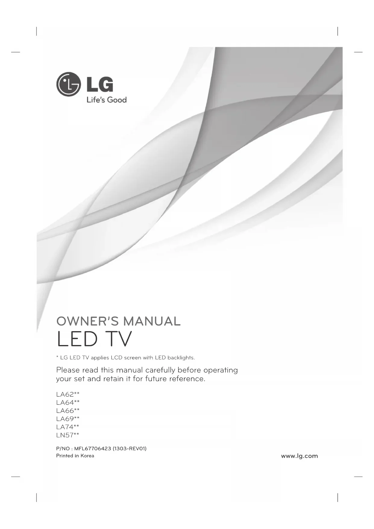 - LG LED TV applies LCD screen with LED backlights. P/NO : MFL67706423 (1303-REV01)Printed in Korea2 ENG ENGLISH