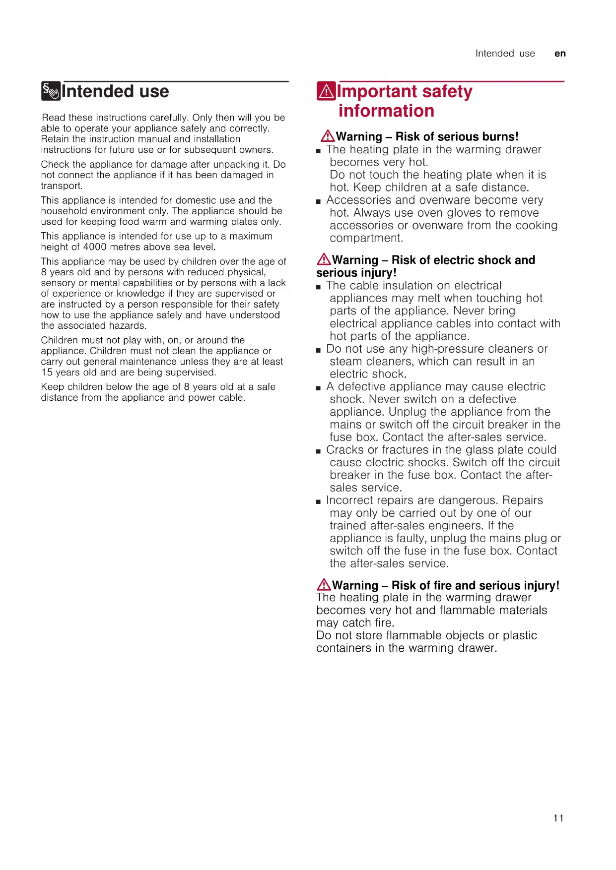 8Intended use Intended use Read these instructions carefully. Only then will you be able to operate your appliance safely and correctly. Retain the instruction manual and installation instructions for future use or for subsequent owners. Check the appliance for damage after unpacking it. Do not connect the appliance if it has been damaged in transport. This appliance is intended for domestic use and the household environment only. The appliance should be used for keeping food warm and warming plates only. This appliance is intended for use up to a maximum height of 4000 metres above sea level. This appliance may be used by children over the age of 8 years old and by persons with reduced physical, sensory or mental capabilities or by persons with a lack of experience or knowledge if they are supervised or are instructed by a person responsible for their safety how to use the appliance safely and have understood the associated hazards. Children must not play with, on, or around the appliance. Children must not clean the appliance or carry out general maintenance unless they are at least 15 years old and are being supervised. Keep children below the age of 8 years old at a safe distance from the appliance and power cable. (Important safety information Impor t ant saf et y informat i on :Warning – Risk of serious burns! ■ The heating plate in the warming drawer becomes very hot. Do not touch the heating plate when it is hot. Keep children at a safe distance. Risk of serious burns! ■ Accessories and ovenware become very hot. Always use oven gloves to remove accessories or ovenware from the cooking compartment. :Warning – Risk of electric shock and serious injury! ■ The cable insulation on electrical appliances may melt when touching hot parts of the appliance. Never bring electrical appliance cables into contact with hot parts of the appliance. Risk of electric shock! ■ Do not use any high-pressure cleaners or steam cleaners, which can result in an electric shock. Risk of electric shock! ■ A defective appliance may cause electric shock. Never switch on a defective appliance. Unplug the appliance from the mains or switch off the circuit breaker in the fuse box. Contact the after-sales service. Risk of electric shock! ■ Cracks or fractures in the glass plate could cause electric shocks. Switch off the circuit breaker in the fuse box. Contact the after- sales service. Risk of electric shock! ■ Incorrect repairs are dangerous. Repairs may only be carried out by one of our trained after-sales engineers. If the appliance is faulty, unplug the mains plug or switch off the fuse in the fuse box. Contact the after-sales service. :Warning – Risk of fire and serious injury! The heating plate in the warming drawer becomes very hot and flammable materials may catch fire. Do not store flammable objects or plastic containers in the warming drawer.en Getting to know your appliance