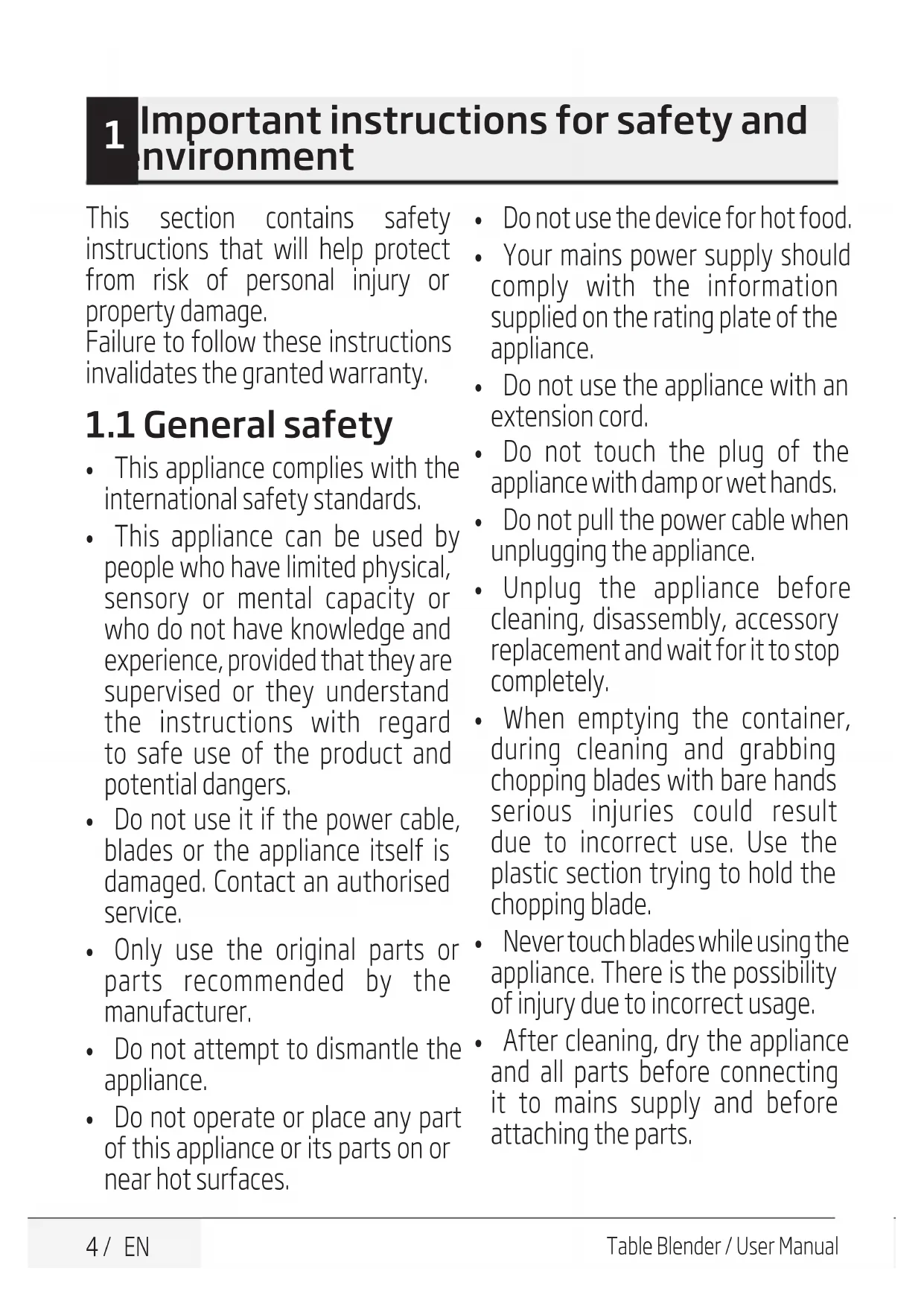 Table Blender / User Manual This section contains safety instructions that will help protect from risk of personal injury or property damage. Failure to follow these instructions invalidates the granted warranty.