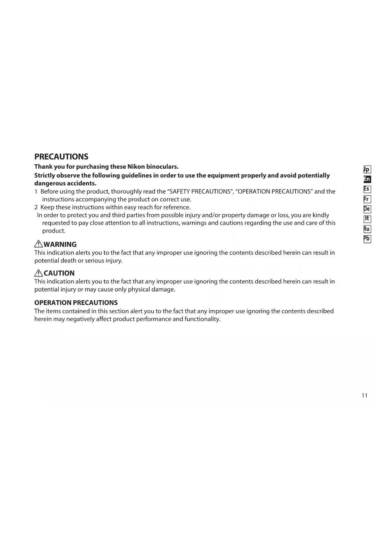 PRECAUTIONS Thank you for purchasing these Nikon binoculars. Strictly observe the following guidelines in order to use the equipment properly and avoid potentially dangerous accidents. 1 Before using the product, thoroughly read the “SAFETY PRECAUTIONS”, “OPERATION PRECAUTIONS” and the instructions accompanying the product on correct use. 2 Keep these instructions within easy reach for reference. In order to protect you and third parties from possible injury and/or property damage or loss, you are kindly requested to pay close attention to all instructions, warnings and cautions regarding the use and care of this product. WARNING This indication alerts you to the fact that any improper use ignoring the contents described herein can result in potential death or serious injury. CAUTION This indication alerts you to the fact that any improper use ignoring the contents described herein can result in potential injury or may cause only physical damage. OPERATION PRECAUTIONS The items contained in this section alert you to the fact that any improper use ignoring the contents described herein may negatively affect product performance and functionality.12