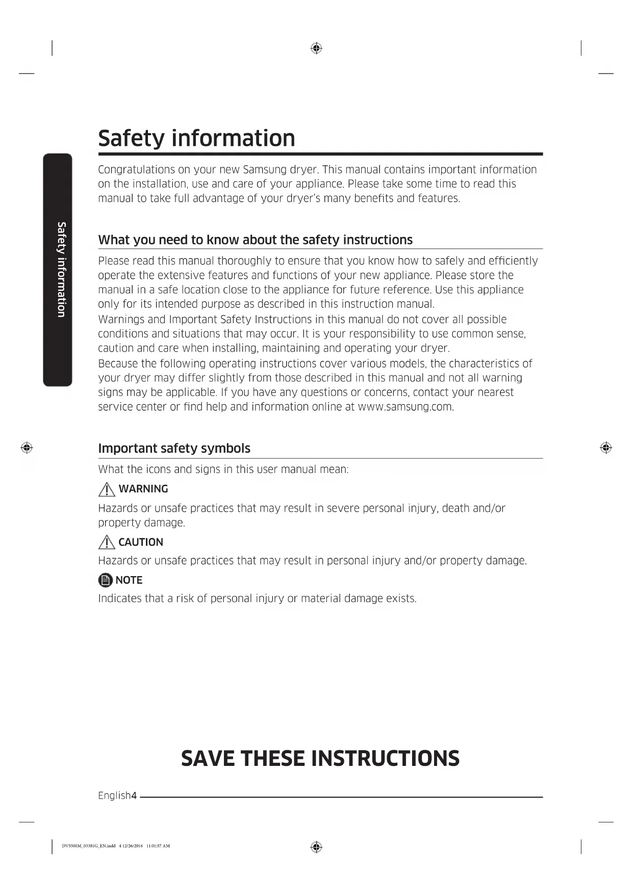 English4 Safety information Congratulations on your new Samsung dryer. This manual contains important information on the installation, use and care of your appliance. Please take some time to read this manual to take full advantage of your dryer’s many benets and features. What you need to know about the safety instructions Please read this manual thoroughly to ensure that you know how to safely and efciently operate the extensive features and functions of your new appliance. Please store the manual in a safe location close to the appliance for future reference. Use this appliance only for its intended purpose as described in this instruction manual. Warnings and Important Safety Instructions in this manual do not cover all possible conditions and situations that may occur. It is your responsibility to use common sense, caution and care when installing, maintaining and operating your dryer. Because the following operating instructions cover various models, the characteristics of your dryer may differ slightly from those described in this manual and not all warning signs may be applicable. If you have any questions or concerns, contact your nearest service center or nd help and information online at www.samsung.com. Important safety symbols What the icons and signs in this user manual mean: WARNING Hazards or unsafe practices that may result in severe personal injury, death and/or property damage. CAUTION Hazards or unsafe practices that may result in personal injury and/or property damage. NOTE Indicates that a risk of personal injury or material damage exists. DV5500M_03381G_EN.indd 4 12/26/2016 11:01:57 AMSafety information