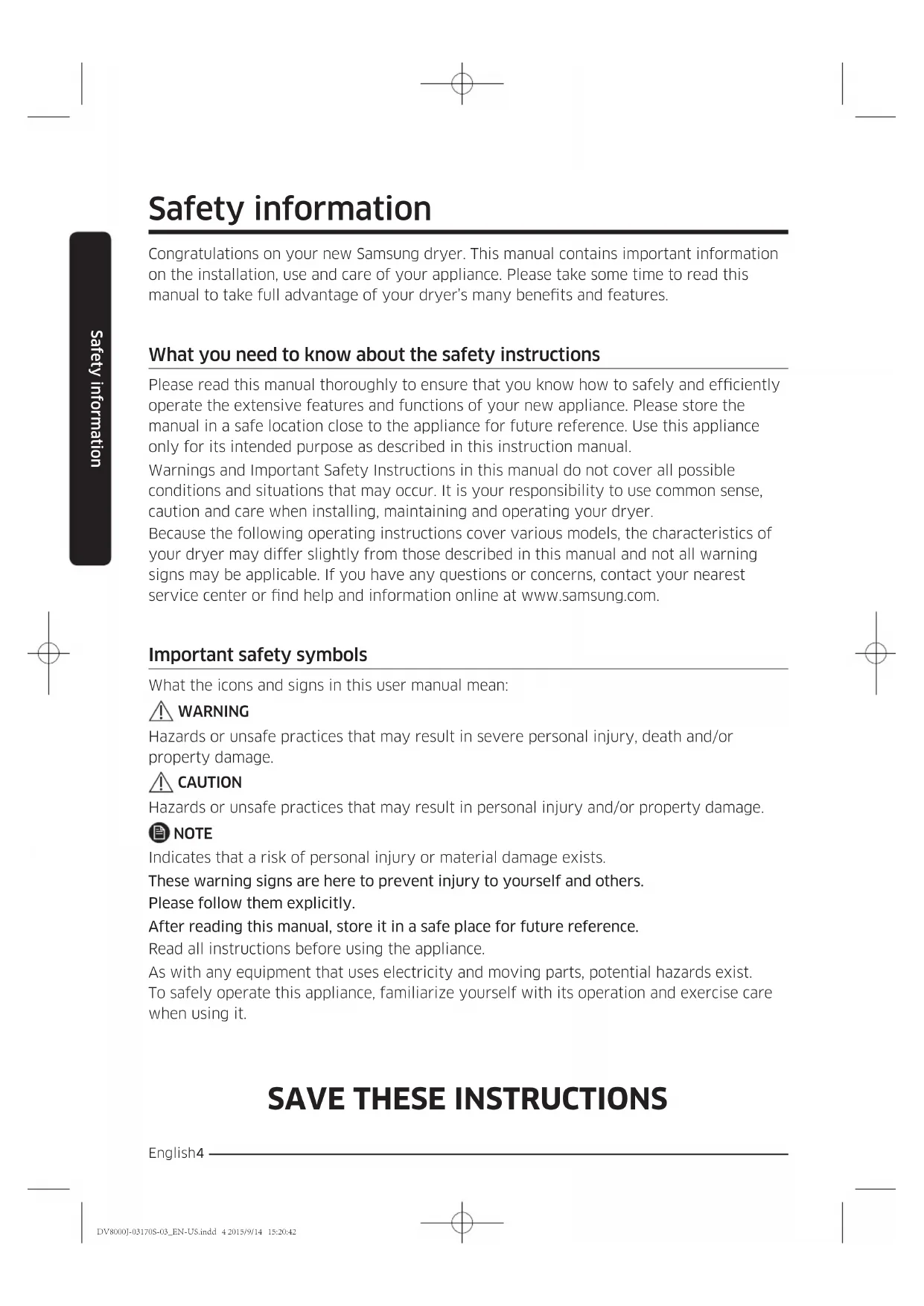 English4 Safety information Congratulations on your new Samsung dryer. This manual contains important information on the installation, use and care of your appliance. Please take some time to read this manual to take full advantage of your dryer’s many benets and features. What you need to know about the safety instructions Please read this manual thoroughly to ensure that you know how to safely and efciently operate the extensive features and functions of your new appliance. Please store the manual in a safe location close to the appliance for future reference. Use this appliance only for its intended purpose as described in this instruction manual. Warnings and Important Safety Instructions in this manual do not cover all possible conditions and situations that may occur. It is your responsibility to use common sense, caution and care when installing, maintaining and operating your dryer. Because the following operating instructions cover various models, the characteristics of your dryer may differ slightly from those described in this manual and not all warning signs may be applicable. If you have any questions or concerns, contact your nearest service center or nd help and information online at www.samsung.com. Important safety symbols What the icons and signs in this user manual mean: WARNING Hazards or unsafe practices that may result in severe personal injury, death and/or property damage. CAUTION Hazards or unsafe practices that may result in personal injury and/or property damage. NOTE Indicates that a risk of personal injury or material damage exists. These warning signs are here to prevent injury to yourself and others. Please follow them explicitly. After reading this manual, store it in a safe place for future reference. Read all instructions before using the appliance. As with any equipment that uses electricity and moving parts, potential hazards exist. To safely operate this appliance, familiarize yourself with its operation and exercise care when using it. DV8000J-03170S-03_EN-US.indd 4 2015/9/14 15:20:42Safety information