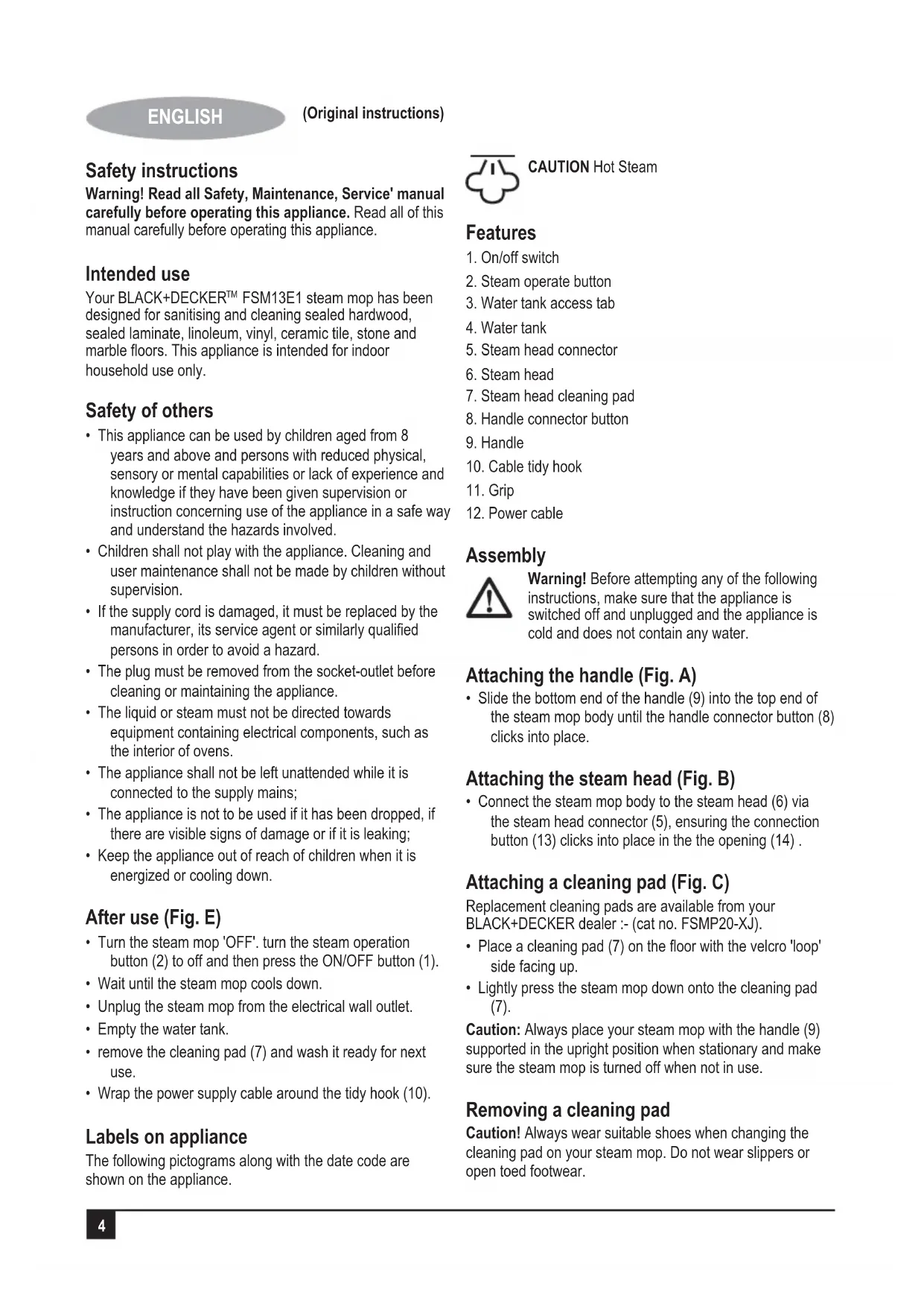 - Connect the steam mop body to the steam head (6) via the steam head connector (5), ensuring the connection button (13) clicks into place in the the opening (14) . Attaching a cleaning pad (Fig. C) Replacement cleaning pads are available from your BLACK+DECKER dealer :- (cat no. FSMP20-XJ).