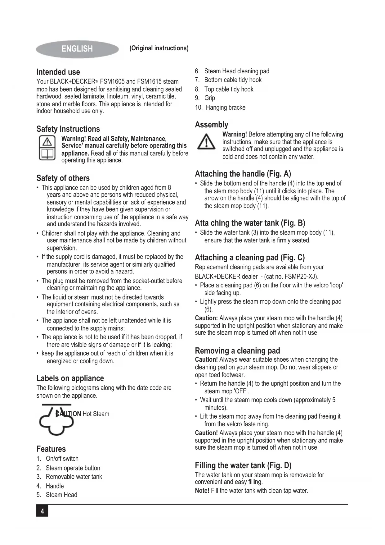- Lift the steam mop away from the cleaning pad freeing it from the velcro faste ning. Caution! Always place your steam mop with the handle (4) supported in the upright position when stationary and make sure the steam mop is turned off when not in use. Filling the water tank (Fig. D) The water tank on your steam mop is removable for convenient and easy filling. Note! Fill the water tank with clean tap water.5 ENGLISH (Original instructions) Note! In areas of hard water, the use of de-ionised water is recommended.