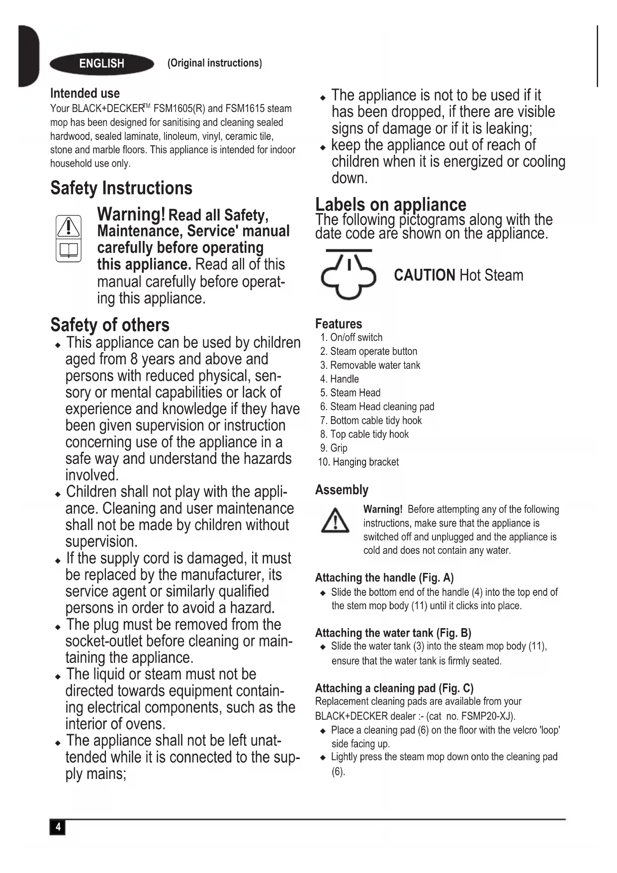 Warning! Read all Safety, Maintenance, Service' manual carefully before operating this appliance. Read all of this manual carefully before operat- ing this appliance. Safety of others u This appliance can be used by children aged from 8 years and above and persons with reduced physical, sen- sory or mental capabilities or lack of experience and knowledge if they have been given supervision or instruction concerning use of the appliance in a safe way and understand the hazards involved. u Children shall not play with the appli- ance. Cleaning and user maintenance shall not be made by children without supervision. u If the supply cord is damaged, it must be replaced by the manufacturer, its service agent or similarly qualied persons in order to avoid a hazard. u The plug must be removed from the socket-outlet before cleaning or main- taining the appliance. u The liquid or steam must not be directed towards equipment contain- ing electrical components, such as the interior of ovens. u The appliance shall not be left unat- tended while it is connected to the sup- ply mains; u The appliance is not to be used if it has been dropped, if there are visible signs of damage or if it is leaking; u keep the appliance out of reach of children when it is energized or cooling down. Labels on appliance The following pictograms along with the date code are shown on the appliance. CAUTION Hot Steam Features 1. On/off switch 2. Steam operate button 3. Removable water tank 4. Handle 5. Steam Head 6. Steam Head cleaning pad 7. Bottom cable tidy hook 8. Top cable tidy hook 9. Grip 10. Hanging bracket Assembly Warning! Before attempting any of the following instructions, make sure that the appliance is switched off and unplugged and the appliance is cold and does not contain any water. Attaching the handle (Fig. A) u Slide the bottom end of the handle (4) into the top end of the stem mop body (11) until it clicks into place. Attaching the water tank (Fig. B) u Slide the water tank (3) into the steam mop body (11), ensure that the water tank is rmly seated. Attaching a cleaning pad (Fig. C) Replacement cleaning pads are available from your BLACK+DECKER dealer :- (cat no. FSMP20-XJ). u Place a cleaning pad (6) on the oor with the velcro 'loop' side facing up.u Lightly press the steam mop down onto the cleaning pad (6).5 ENGLISH (Original instructions) Caution: Always place your steam mop with the handle (4) supported in the upright position when stationary and make sure the steam mop is turned off when not in use. Removing a cleaning pad Caution! Always wear suitable shoes when changing the cleaning pad on your steam mop. Do not wear slippers or open toed footwear. u Return the handle (4) to the upright position and turn the steam mop 'OFF'. u Wait until the steam mop cools down (approximately 5 minutes). u Lift the steam mop away from the cleaning pad freeing it from the velcro fastening. Caution! Always place your steam mop with the handle (4) supported in the upright position when stationary and make sure the steam mop is turned off when not in use. Filling the water tank (Fig. D) The water tank on your steam mop is removable for convenient and easy lling. Note! Fill the water tank with clean tap water. Note! In areas of hard water, the use of de-ionised water is recommended. u Remove the water tank (3). u Remove the lter cap by unscrewing in an anti-clockwise direction. u Fill the water tank (3) with water. Warning! Your water tank has a 350ml capacity. Do not over ll the tank. u Replace the lter cap by screwing in a clockwise direction. u Re-t the water tank (3). Note! Ensure the lter cap is rmly secured. Note! Do not use chemical cleaners with your steam mop water tank. Use Important! This unit will kill 99.9% of bacteria and germs when used in accordance with the instructions in this manual and with the micro bre pad tted and a continuous run time of 90 seconds. Switching on and off u To switch the appliance on, press the ON/Off button (1). It takes approximately 15 seconds for the steam mop to heat up. u Press the steam operation button (2). This will operate the pump and the unit will begin to produce steam. u To stop steam generation, turn the steam operation button (2) to off. This will maintain power to the boiler for quicker start up. u To switch the appliance off, press the ON/Off button (1). Caution! Never leave the steam mop in one spot on any surface for any period of time. Always place the steam mop with the handle (4) supported in the upright position when stationary and make sure the steam mop is turned off when not in use. Caution! Always empty the steam mop after use. Note! When rst lled or after running dry, it can take up to 45 seconds for steam to be produced. Hints for optimum use General Caution: Never use the steam mop without rst attaching a cleaning pad. u Always vacuum or sweep the oor before using the steam mop. u The easiest way to use the appliance is to tilt the handle to a 45º angle and clean slowly, covering a small area at a time. u Do not use chemical cleaners with your steam mop. To remove stubborn stains from vinyl or linoleum oors, you can pre-treat with a mild detergent and some water before using the steam mop. Steam Cleaning u Place a cleaning pad (6) on the oor with the velcro 'loop' side facing up. u Lightly press the steam mop down onto the cleaning pad (6). u Connect the steam mop to the mains. u Press the ON/OFF button (1). It takes approximately 15 seconds for the steam mop to heat up. u Press the steam operate button (2). After a few seconds, steam will start to come out of the steam head. Note! When rst lled or after running dry, it can take up to 45 seconds for steam to be produced. u It takes a few seconds for steam to enter the cleaning pad. The steam mop will now glide easily over the surface to be sanitized/cleaned. u Push and pull the steam mop slowly across the surface to thoroughly steam clean each section. u When you have nished using the steam mop, r