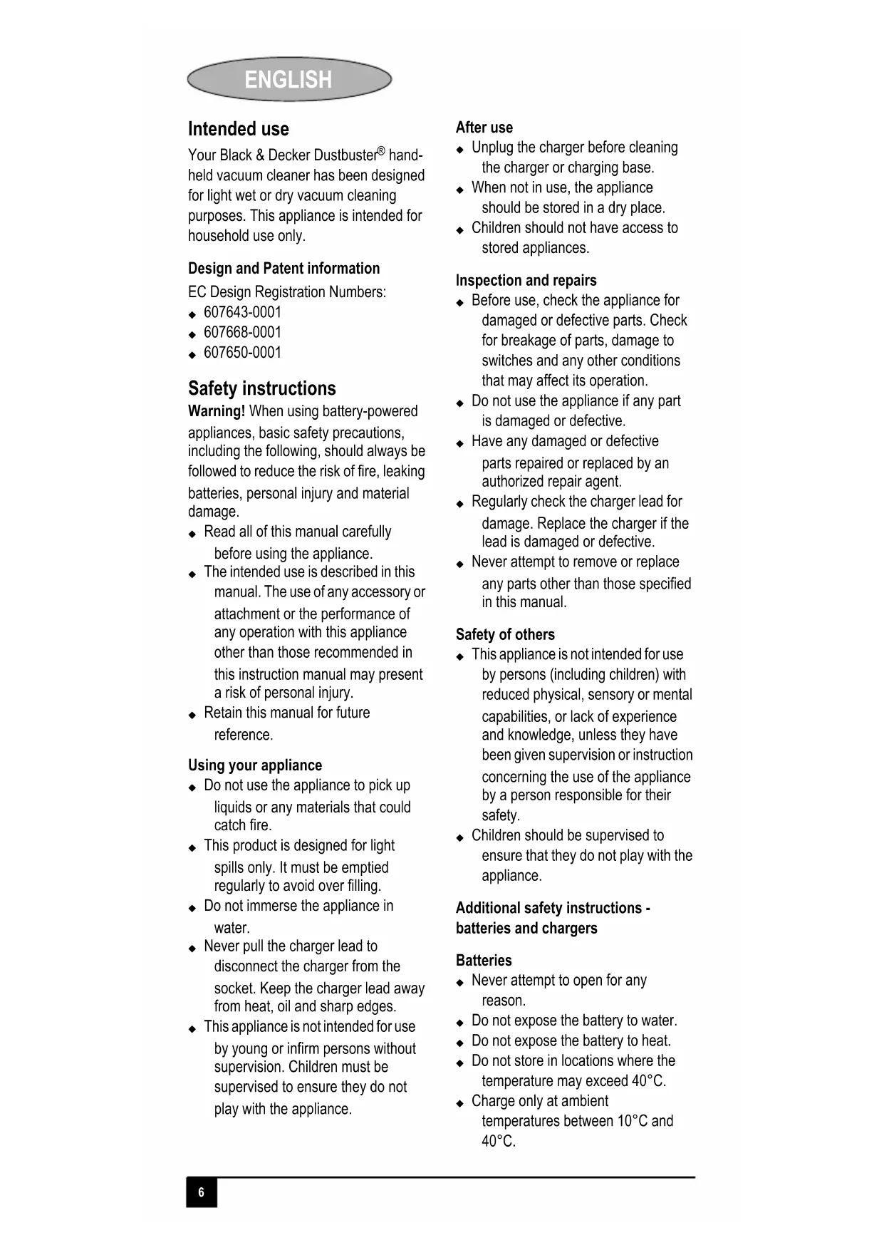 Your Black & Decker Dustbuster® hand-held vacuum cleaner has been designed for light wet or dry vacuum cleaning purposes. This appliance is intended for household use only.