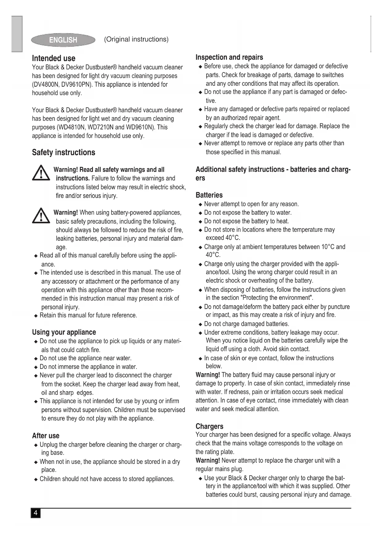 ENGLISH (Original instructions) Intended use Your Black & Decker Dustbuster® handheld vacuum cleaner has been designed for light dry vacuum cleaning purposes (DV4800N, DV9610PN). This appliance is intended for household use only. Your Black & Decker Dustbuster® handheld vacuum cleaner has been designed for light wet and dry vacuum cleaning purposes (WD4810N, WD7210N and WD9610N). This appliance is intended for household use only. Safety instructions