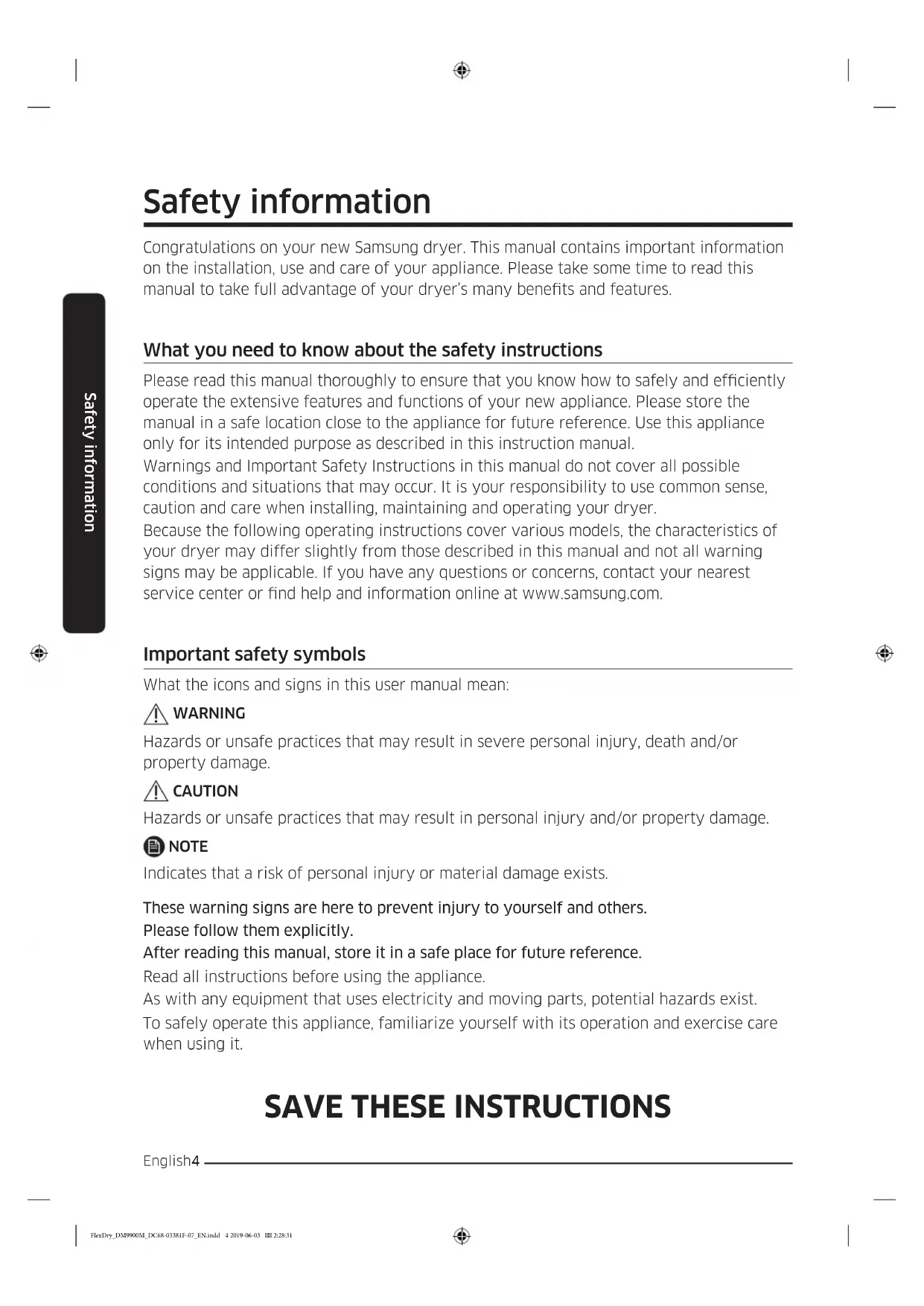 - Save these instructions. FlexDry_DM9900M_DC68-03381F-07_EN.indd 5 2019-06-03 2:28:32SAVE THESE INSTRUCTIONS Safety information Safety information
