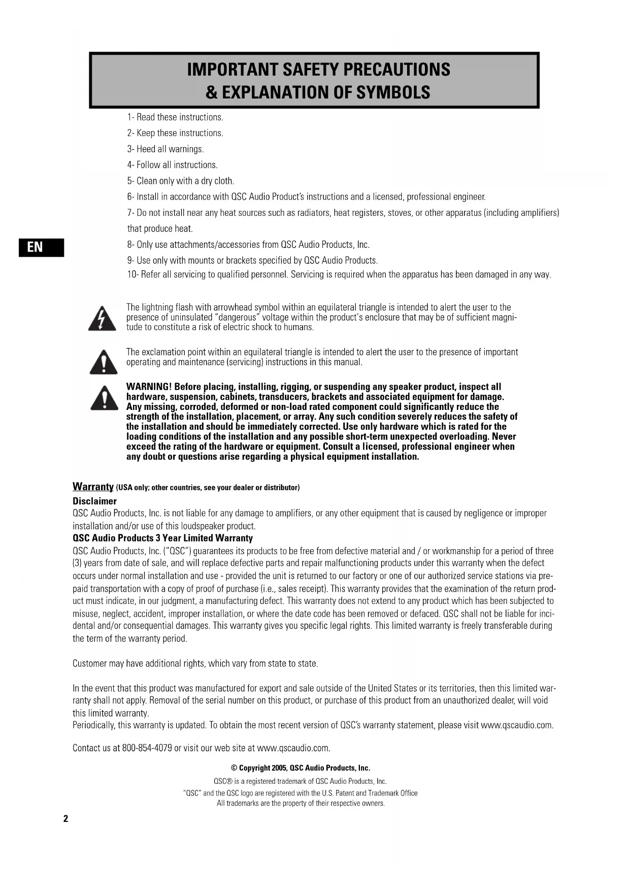 The lightning flash with arrowhead symbol within an equilateral triangle is intended to alert the user to the presence of uninsulated “dangerous” voltage within the product’s enclosure that may be of sufficient magni- tude to constitute a risk of electric shock to humans. The exclamation point within an equilateral triangle is intended to alert the user to the presence of important operating and maintenance (servicing) instructions in this manual. WARNING! Before placing, installing, rigging, or suspending any speaker product, inspect all hardware, suspension, cabinets, transducers, brackets and associated equipment for damage. Any missing, corroded, deformed or non-load rated component could significantly reduce the strength of the installation, placement, or array. Any such condition severely reduces the safety of the installation and should be immediately corrected. Use only hardware which is rated for the loading conditions of the installation and any possible short-term unexpected overloading. Never exceed the rating of the hardware or equipment. Consult a licensed, professional engineer when any doubt or questions arise regarding a physical equipment installation. © Copyright 2005, QSC Audio Products, Inc. QSC® is a registered trademark of QSC Audio Products, Inc. “QSC” and the QSC logo are registered with the U.S. Patent and Trademark Office All trademarks are the property of their respective owners. Warranty (USA only; other countries, see your dealer or distributor) Disclaimer QSC Audio Products, Inc. is not liable for any damage to amplifiers, or any other equipment that is caused by negligence or improper installation and/or use of this loudspeaker product. QSC Audio Products 3 Year Limited Warranty QSC Audio Products, Inc. (“QSC”) guarantees its products to be free from defective material and / or workmanship for a period of three (3) years from date of sale, and will replace defective parts and repair malfunctioning products under this warranty when the defect occurs under normal installation and use - provided the unit is returned to our factory or one of our authorized service stations via pre- paid transportation with a copy of proof of purchase (i.e., sales receipt). This warranty provides that the examination of the return prod- uct must indicate, in our judgment, a manufacturing defect. This warranty does not extend to any product which has been subjected to misuse, neglect, accident, improper installation, or where the date code has been removed or defaced. QSC shall not be liable for inci- dental and/or consequential damages. This warranty gives you specific legal rights. This limited warranty is freely transferable during the term of the warranty period. Customer may have additional rights, which vary from state to state. In the event that this product was manufactured for export and sale outside of the United States or its territories, then this limited war- ranty shall not apply. Removal of the serial number on this product, or purchase of this product from an unauthorized dealer, will void this limited warranty. Periodically, this warranty is updated. To obtain the most recent version of QSC’s warranty statement, please visit www.qscaudio.com. Contact us at 800-854-4079 or visit our web site at www.qscaudio.com.3