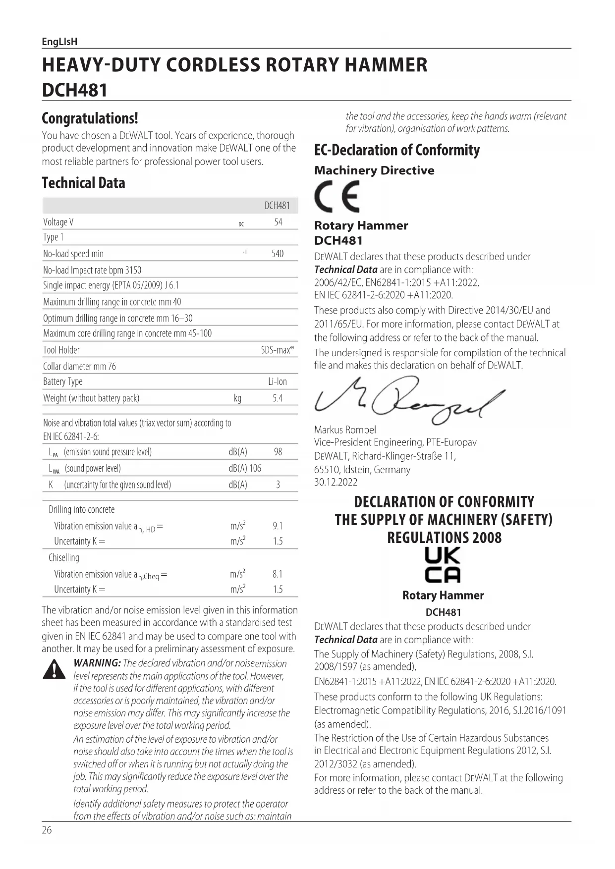 - Lithium-Ionen-Zellen sind recycelbar. Geben Sie die gebrauchten Akkus bei Ihrem Händler oder bei einer kommunalen Recycling-Sammelstelle ab. Dort werden die gesammelten Akkus recycelt oder ordnungsgemäßentsorgt.26 EngLIsH EC-Declaration of Conformity Machinery Directive Rotary Hammer DCH481 DeWALT declares that these products described under Technical Data are in compliance with: 2006/42/EC, EN62841-1:2015 +A11:2022, EN IEC 62841-2-6:2020 +A11:2020.These products also comply with Directive 2014/30/EU and 2011/65/EU. For more information, please contact DeWALT at the following address or refer to the back of themanual.The undersigned is responsible for compilation of the technical file and makes this declaration on behalf ofDeWALT.Markus Rompel Vice-President Engineering, PTE-Europav DeWALT, Richard-Klinger-Straße 11, 65510, Idstein, Germany 30.12.2022