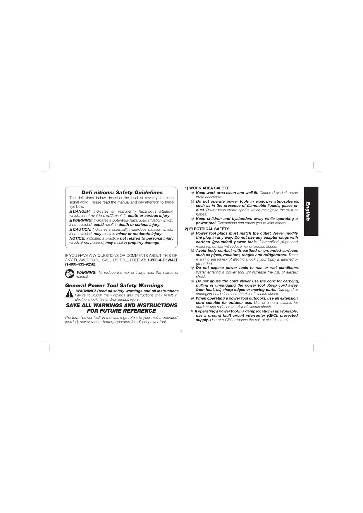 if not avoided, could result in death or serious injury. CAUTION: Indicates a potentially hazardous situation which, if not avoided, may result in minor or moderate injury. NOTICE: Indicates a practice not related to personal injury which, if not avoided, may result in property damage. IF YOU HAVE ANY QUESTIONS OR COMMENTS ABOUT THIS OR ANY D EWALT TOOL, CALL US TOLL FREE AT: 1-800-4-DEWALT (1-800-433-9258).