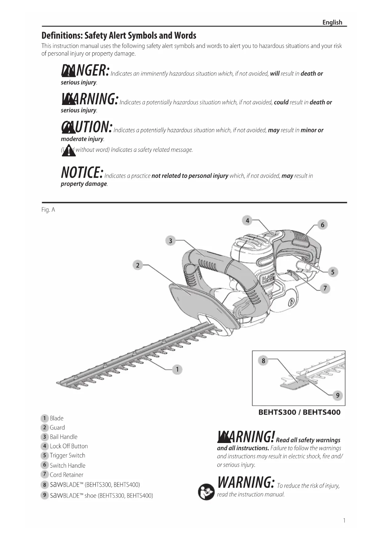 sawBLADE™ shoe (BEHTS300, BEHTS400) Definitions: Safety Alert Symbols and Words This instruction manual uses the following safety alert symbols and words to alert you to hazardous situations and your risk of personal injury or propertydamage.