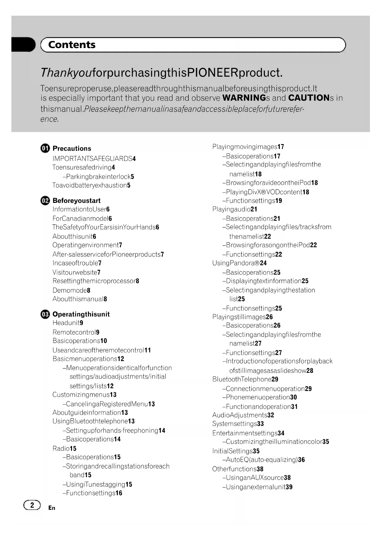 MVH-P8300BT MVH-P7300 English EspañolFrançaisThank you for purchasing this PIONEER product. To ensure proper use, please read through this manual before using this product. It is especially important that you read and observe WARNINGs and CAUTIONsin this manual. Please keep the manual in a safe and accessible place for future refer- ence. Precautions IMPORTANT SAFEGUARDS 4 To ensure safe driving 4 – Parking brake interlock 5 To avoid battery exhaustion 5 Before you start Information to User 6 For Canadian model 6 The Safety of Your Ears is in Your Hands 6 About this unit 6 Operating environment 7 After-sales service for Pioneer products 7 In case of trouble 7 Visit our website 7 Resetting the microprocessor 8 Demo mode 8 About this manual 8 Operating this unit Head unit 9 Remote control 9 Basic operations 10 Use and care of the remote control 11 Basic menu operations 12 – Menu operations identical for function settings/audio adjustments/initial settings/lists 12 Customizing menus 13 – Canceling a Registered Menu 13 About guide information 13 Using Bluetooth telephone 13 – Setting up for hands-free phoning 14 – Basic operations 14 Radio 15 – Basic operations 15 – Storing and recalling stations for each band 15 – Using iTunes tagging 15 – Function settings 16 Playing moving images 17 – Basic operations 17 – Selecting and playing files from the name list 18 – Browsing for a video on the iPod 18 – Playing DivXâ VOD content 18 – Function settings 19 Playing audio 21 – Basic operations 21 – Selecting and playing files/tracks from the name list 22 – Browsing for a song on the iPod 22 – Function settings 22 Using Pandoraâ 24 – Basic operations 25 – Displaying text information 25 – Selecting and playing the station list 25 – Function settings 25 Playing still images 26 – Basic operations 26 – Selecting and playing files from the name list 27 – Function settings 27 – Introduction of operations for playback of still images as a slideshow 28 Bluetooth Telephone 29 – Connection menu operation 29 – Phone menu operation 30 – Function and operation 31 Audio Adjustments 32 System settings 33 Entertainment settings 34 – Customizing the illumination color 35 Initial Settings 35 – Auto EQ (auto-equalizing) 36 Other functions 38 – Using an AUX source 38 – Using an external unit 39 Contents