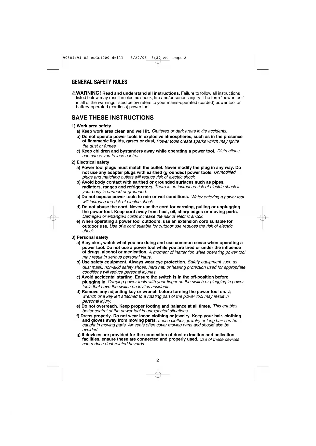 Catalog Numbers BDGL1200, BDGL1440, BDGL1800 90504494 02 BDGL1200 drill 8/29/06 8:39 AM Page 1GENERAL SAFETY RULES WARNING! Read and understand all instructions. Failure to follow all instructions listed below may result in electric shock, fire and/or serious injury. The term “power tool” in all of the warnings listed below refers to your mains-operated (corded) power tool or battery-operated (cordless) power tool.