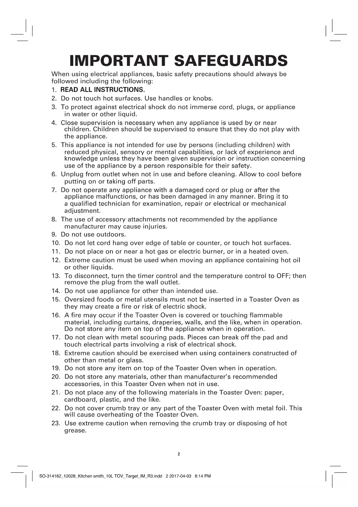 grease. SO-314162_12028_Kitchen smith_10L TOV_Target_IM_R3.indd 2 2017-04-03 6:14 PM3 ADDITIONAL IMPORTANT SAFEGUARDS CAUTION HOT SURFACES: This appliance generates heat and escaping steam during use. Proper precautions must be taken to prevent the risk of burns, res, or other injury to persons or damage to property.