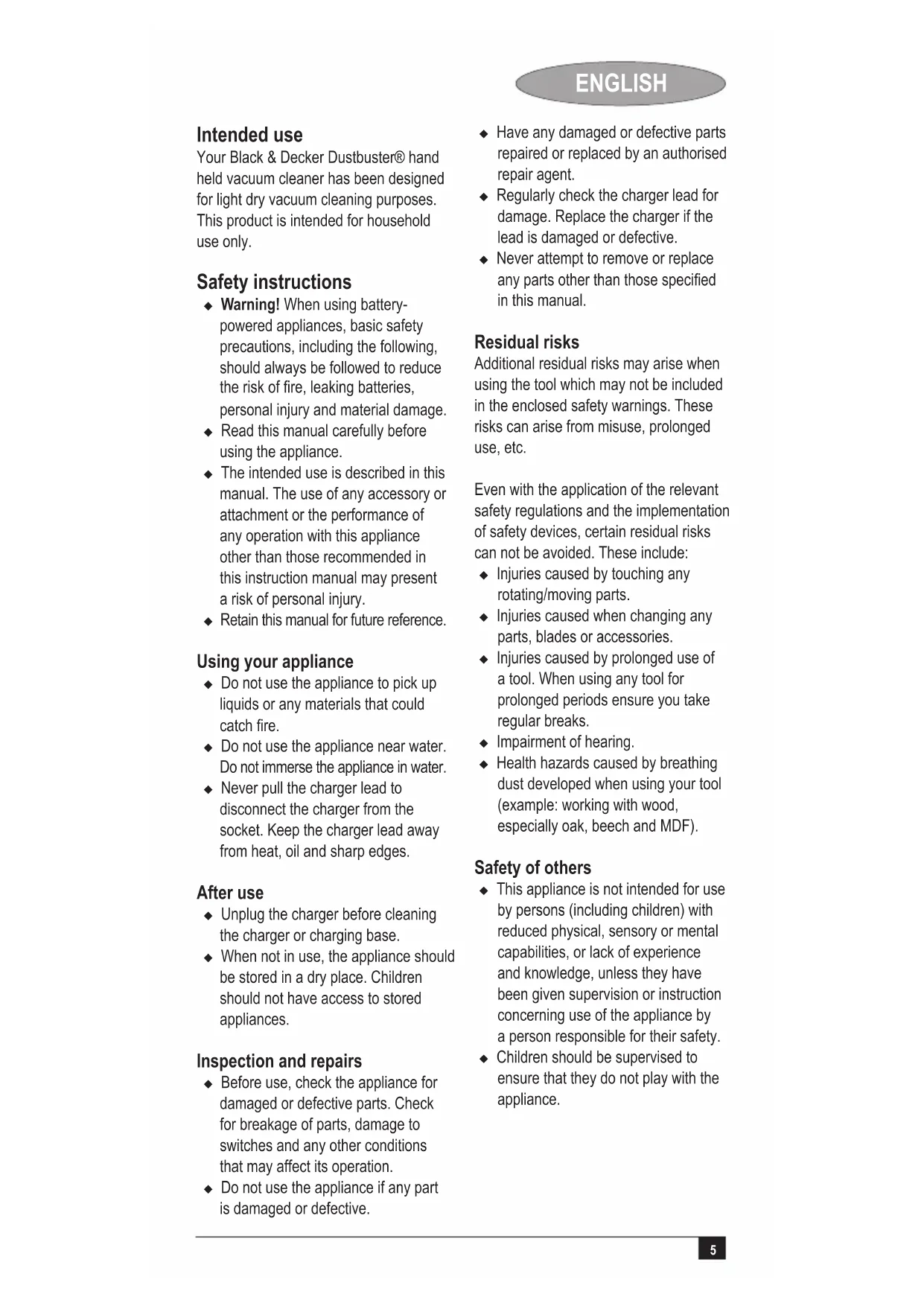 ENGLISH Intended use Your Black & Decker Dustbuster® hand held vacuum cleaner has been designed for light dry vacuum cleaning purposes. This product is intended for household use only. Safety instructions u Warning! When using battery- powered appliances, basic safety precautions, including the following, should always be followed to reduce the risk of re, leaking batteries, personal injury and material damage. u Read this manual carefully before using the appliance. u The intended use is described in this manual. The use of any accessory or attachment or the performance of any operation with this appliance other than those recommended in this instruction manual may present a risk of personal injury. u Retain this manual for future reference. Using your appliance u Do not use the appliance to pick up liquids or any materials that could catch re. u Do not use the appliance near water. Do not immerse the appliance in water. u Never pull the charger lead to disconnect the charger from the socket. Keep the charger lead away from heat, oil and sharp edges. After use u Unplug the charger before cleaning the charger or charging base. u When not in use, the appliance should be stored in a dry place. Children should not have access to stored appliances. Inspection and repairs u Before use, check the appliance for damaged or defective parts. Check for breakage of parts, damage to switches and any other conditions that may affect its operation. u Do not use the appliance if any part is damaged or defective. u Have any damaged or defective parts repaired or replaced by an authorised repair agent. u Regularly check the charger lead for damage. Replace the charger if the lead is damaged or defective. u Never attempt to remove or replace any parts other than those specied in this manual. Residual risks Additional residual risks may arise when using the tool which may not be included in the enclosed safety warnings. These risks can arise from misuse, prolonged use, etc. Even with the application of the relevant safety regulations and the implementation of safety devices, certain residual risks can not be avoided. These include: u Injuries caused by touching any rotating/moving parts. u Injuries caused when changing any parts, blades or accessories. u Injuries caused by prolonged use of a tool. When using any tool for prolonged periods ensure you take regular breaks. u Impairment of hearing.u Health hazards caused by breathing dust developed when using your tool (example: working with wood, especially oak, beech and MDF). Safety of others u This appliance is not intended for use by persons (including children) with reduced physical, sensory or mental capabilities, or lack of experience and knowledge, unless they have been given supervision or instruction concerning use of the appliance by a person responsible for their safety. u Children should be supervised to ensure that they do not play with the appliance.6 ENGLISH Additional safety instructions for batteries and chargers Batteries u Never attempt to open for any reason.u Do not expose the battery to water.u Do not expose the battery to heat.u Do not store in locations where the temperature may exceed 40 °C. u Charge only at ambient temperatures between 10 °C and 40 °C. u Charge only using the charger provided with the appliance/tool. u When disposing of batteries, follow the instructions given in the section "Protecting the environment". u Do not damage/deform the battery pack either by puncture or impact, as this may create a risk of injury and re. u Do not charge damaged batteries.u Under extreme conditions, battery leakage may occur. When you notice liquid on the batteries, proceed as follows: u Carefully wipe the liquid off using a cloth. Avoid skin contact. u In case of skin or eye contact, follow the instructions below. Warning! The battery uid may cause personal injury or damage to property. In case of skin contact, immediately rinse with water. If redness, pain or irritation occurs seek medical attention. In case of eye contact, rinse immediately with clean water and seek medical attention. Chargers Your charger has been designed for a specic voltage. Always check that the mains voltage corresponds to the voltage on the rating plate. Warning! Never attempt to replace the charger unit with a regular mains plug. u Use your Black & Decker charger only to charge the battery in the appliance/tool with which it was supplied. Other batteries could burst, causing personal injury and damage. u Never attempt to charge non- rechargeable batteries. u If the supply cord is damaged, it must be replaced by the manufacturer or an authorised Black & Decker Service Centre in order to avoid a hazard. u Do not expose the charger to water.u Do not open the charger.u Do not probe the charger.u The appliance/tool/battery must be placed in a well ventilated area when charging. Electrical safety Your charger has been designed for a specic mains voltage. Always check that the mains voltage corresponds to the voltage on the rating plate.